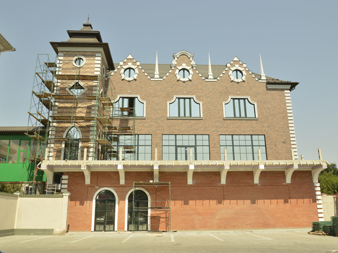 Здание было построено из приличного российского кирпича, так что фасад сам по себе смотрелся неплохо. Однако заказчик пожелал уложить дополнительный слой плитки, имитирующий кладку клинкерным кирпичом. На мой взгляд, эстетически фасад только выиграл. Кроме того, теперь проблем с уходом заметно поубавится, и можно быть уверенным, что с годами здание не утратит первоначальной привлекательности.