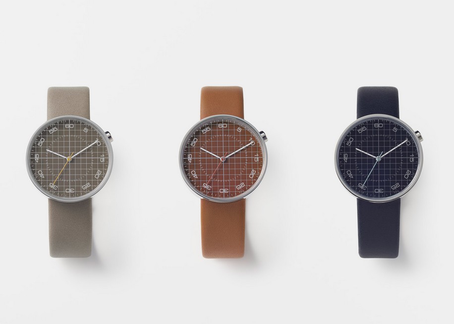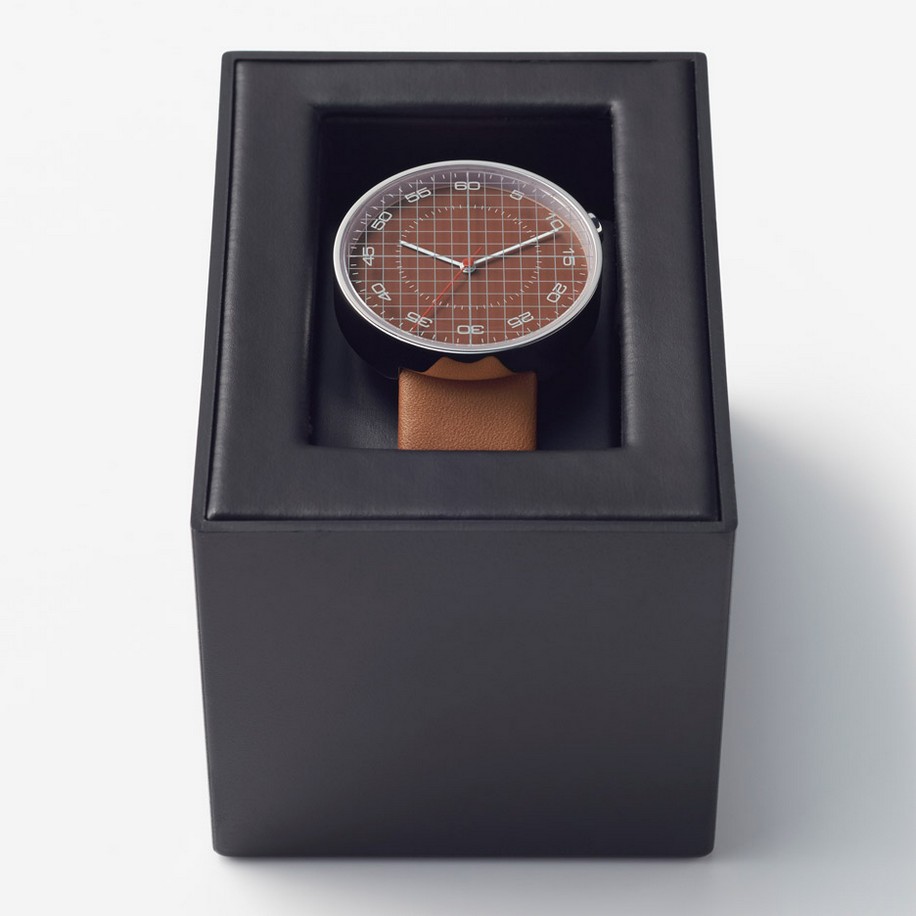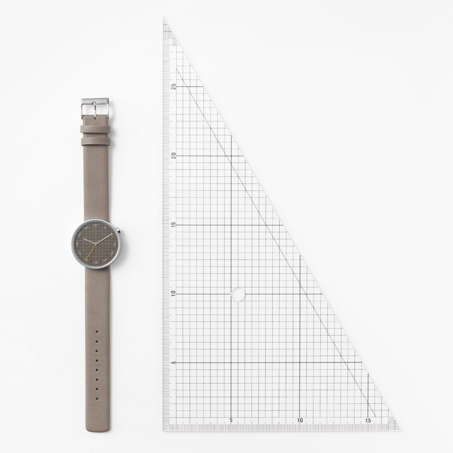 При создании часов дизайнеры вдохновлялись традиционными инструментами, которые использует в своей работе чертежник, к примеру, бумагой-миллиметровкой. Серая квадратная сетка и часовая/минутная разметка нанесены на внутреннюю сторону стекла. Часы доступны к трех цветах: коричневом, черном и сером.