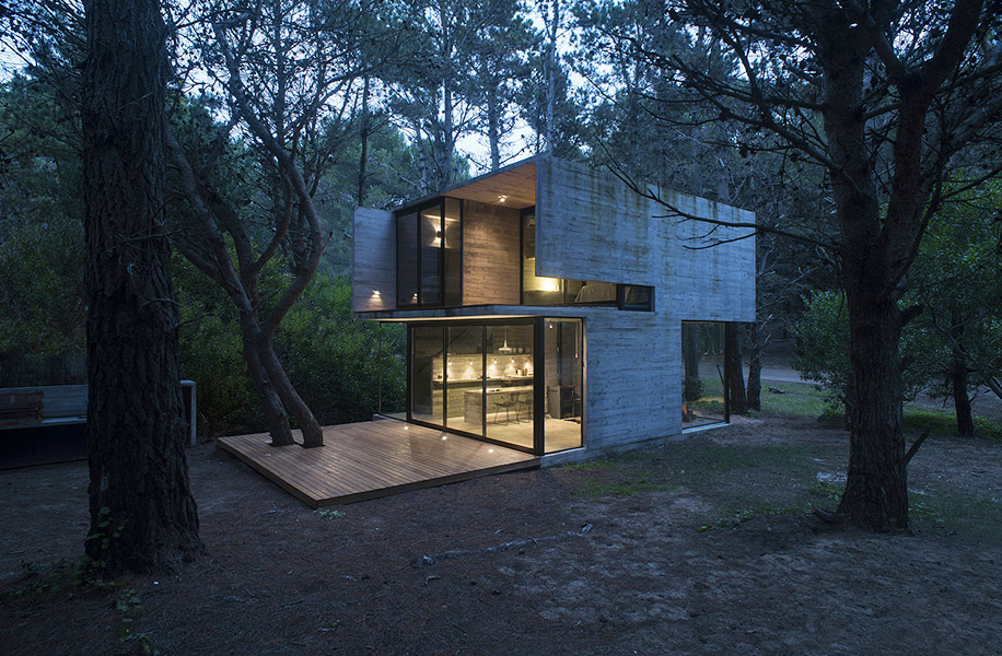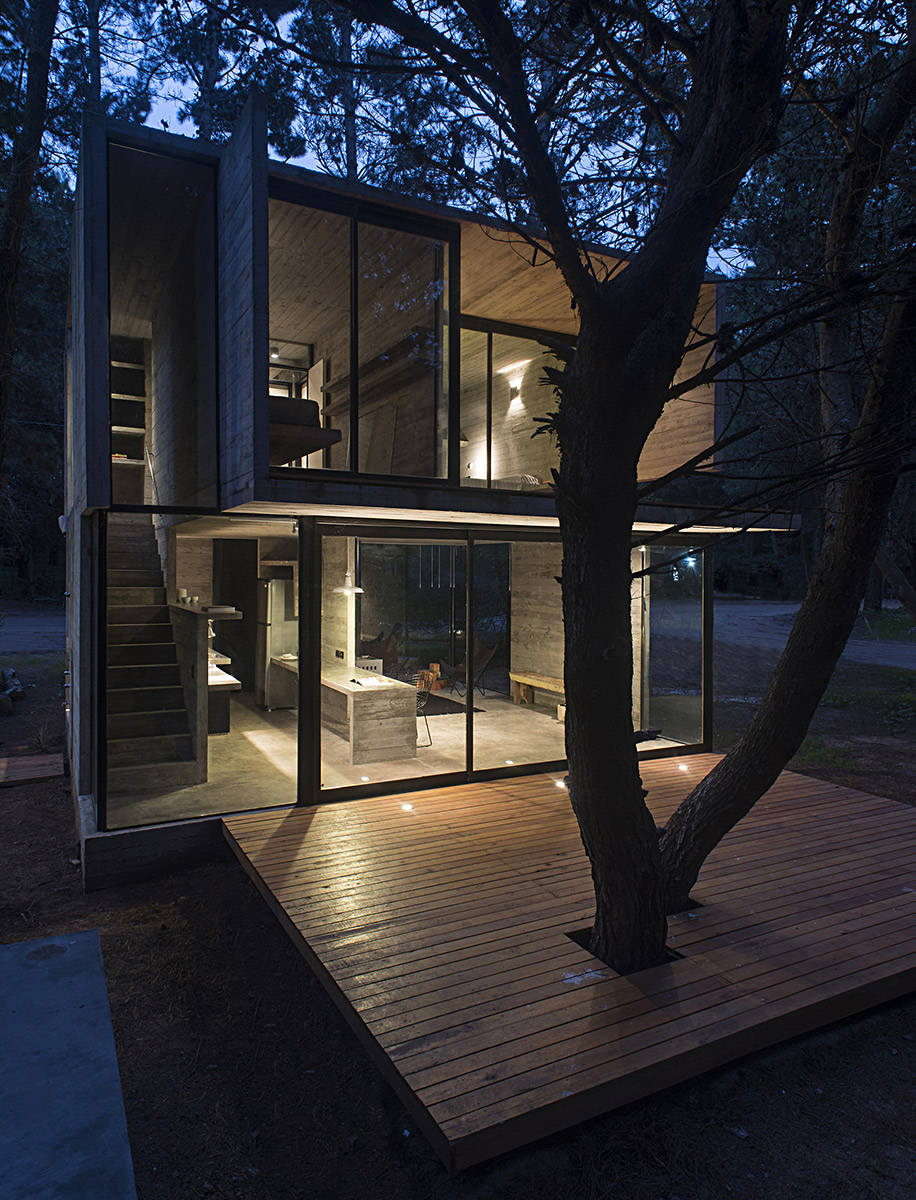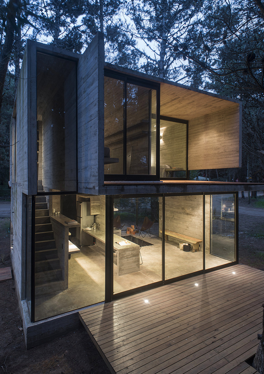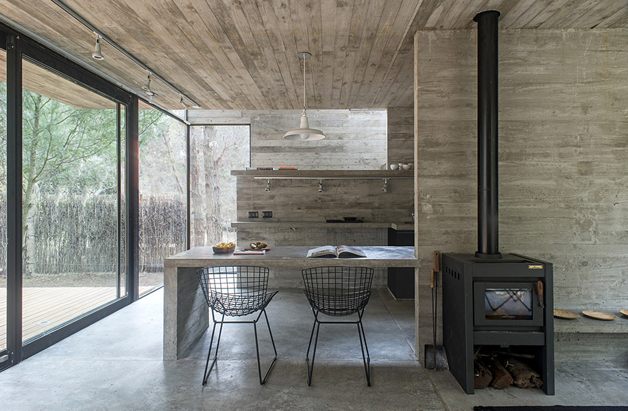 Архитектурное бюро Luciano Kruk построило дом на 75 м² в хвойных лесах Аргентины, где по очереди будут отдыхать три семейства. Главным условием было уложиться в весьма скромный бюджет. Поэтому стены, пол, потолок и даже часть мебели выполнили из бетона — недорогого материала, которому почти не нужен уход.