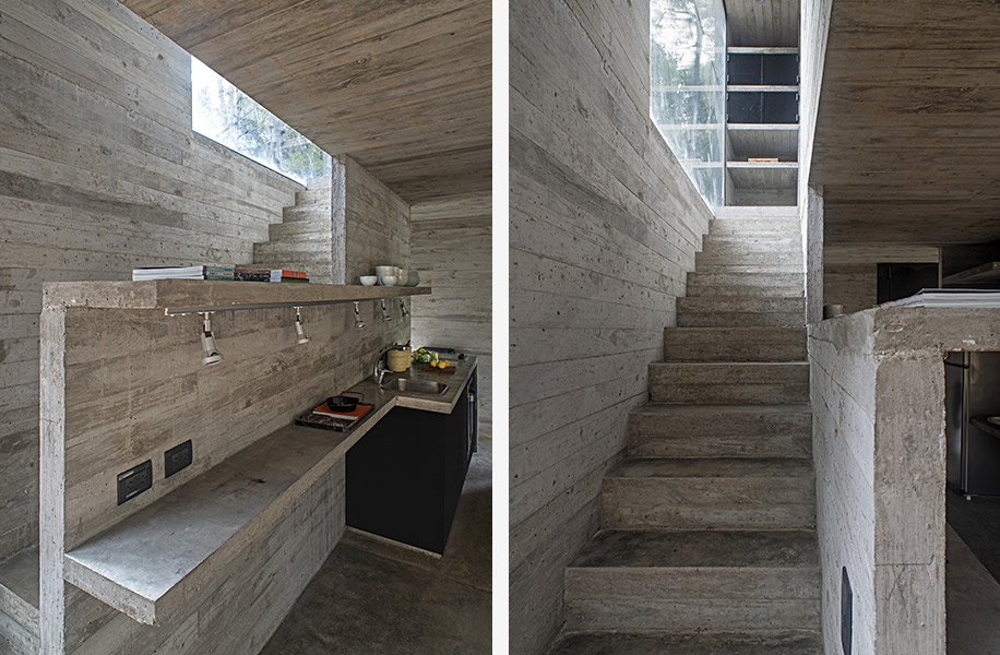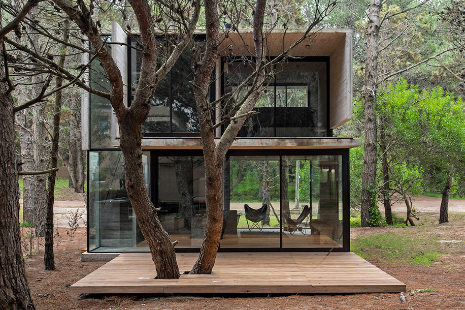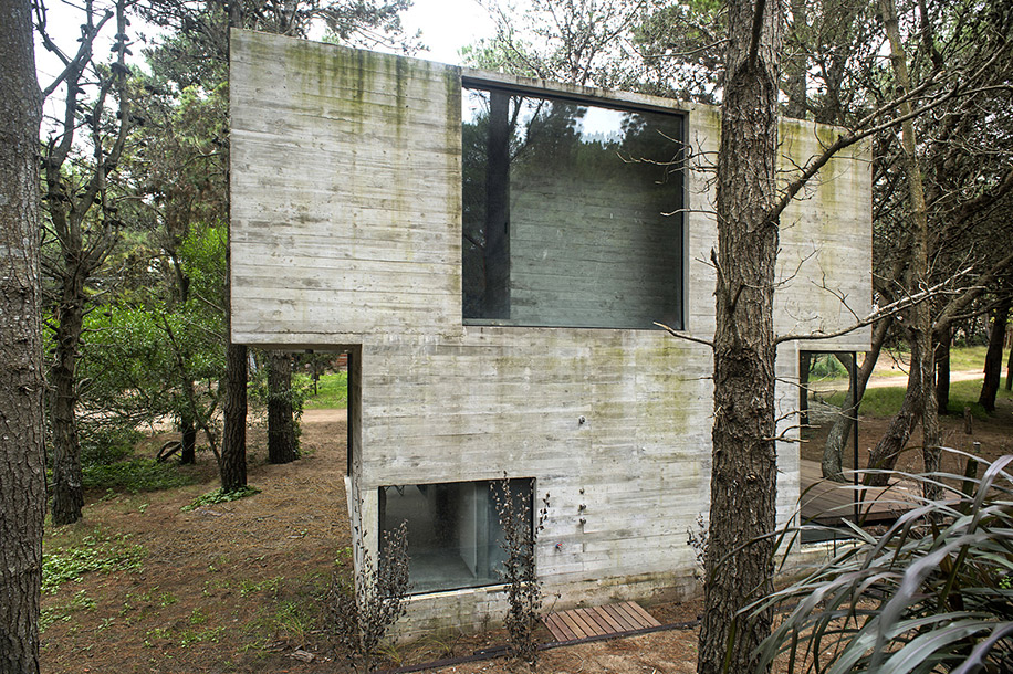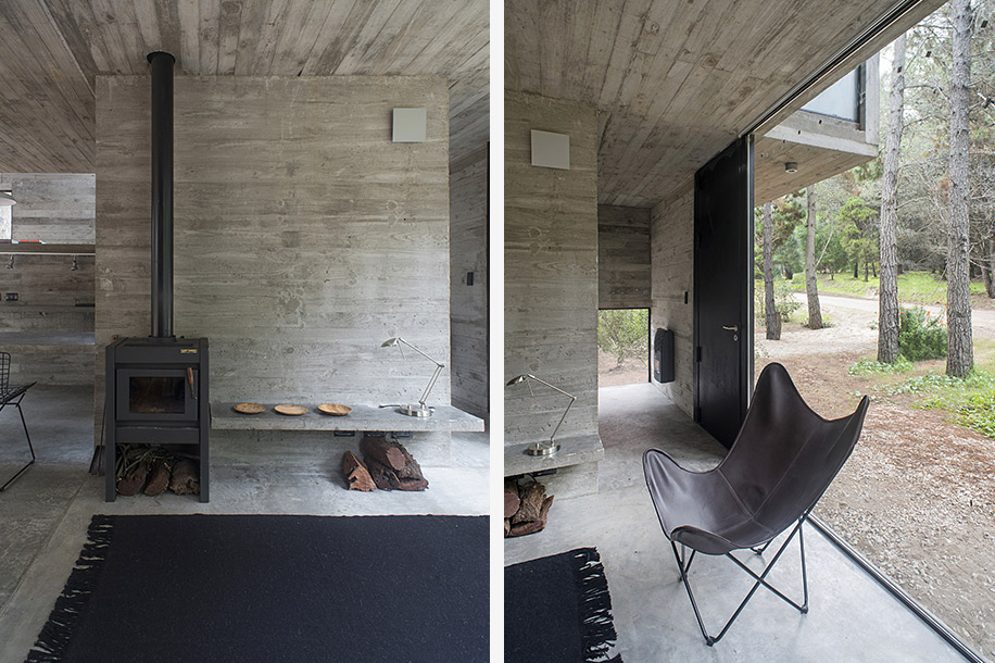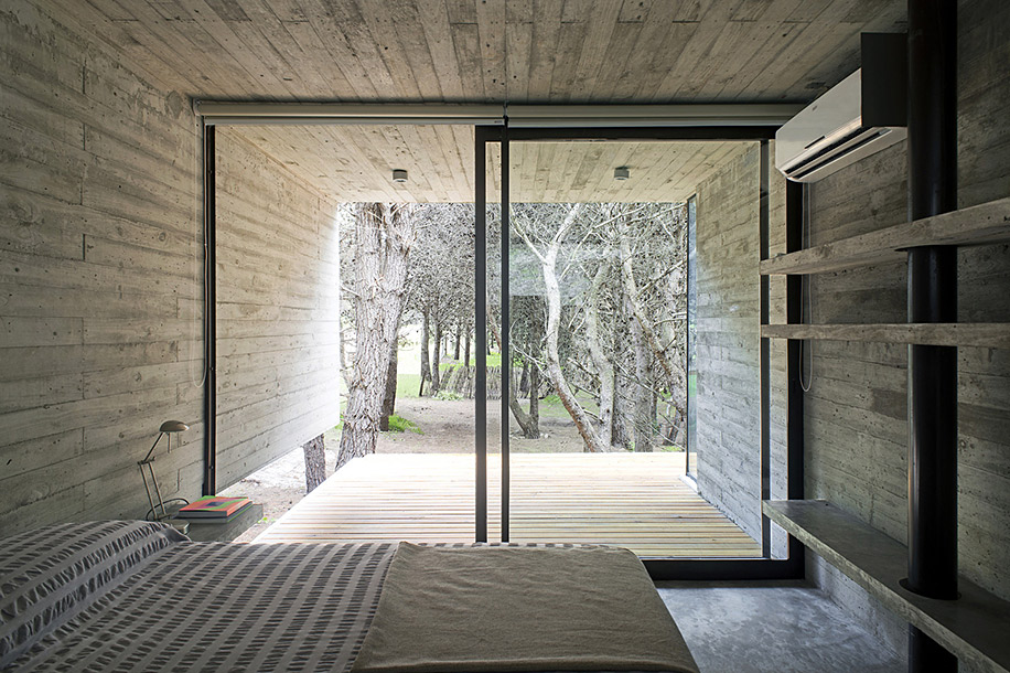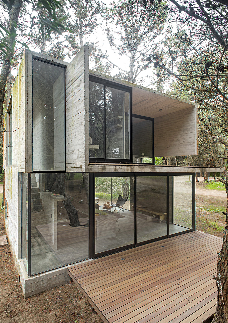 Архитектурное бюро Luciano Kruk построило дом на 75 м² в хвойных лесах Аргентины, где по очереди будут отдыхать три семейства. Главным условием было уложиться в весьма скромный бюджет. Поэтому стены, пол, потолок и даже часть мебели выполнили из бетона — недорогого материала, которому почти не нужен уход.