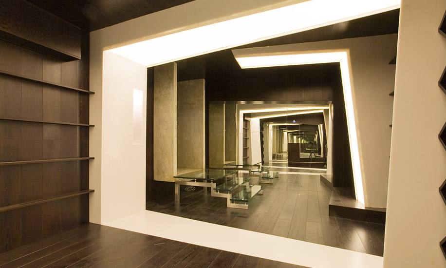 Петр Зайцев, архитектор мастерской za bor: «Клиент хотел, чтобы в винном погребе был космос – что-то яркое и экстраординарное. Мы отделали стены искусственным акриловым камнем и сделали подсветку, а в противоположных концах поставили зеркала. Мы любим расширять пространство таким способом. Кстати, в столовой мы использовали тот же метод для “космического эффекта”, но без зеркал: хитроумная пластмассовая стена заставляет чувствовать себя в будущем на своего рода космическом корабле, особенно когда включаете сложную подсветку».