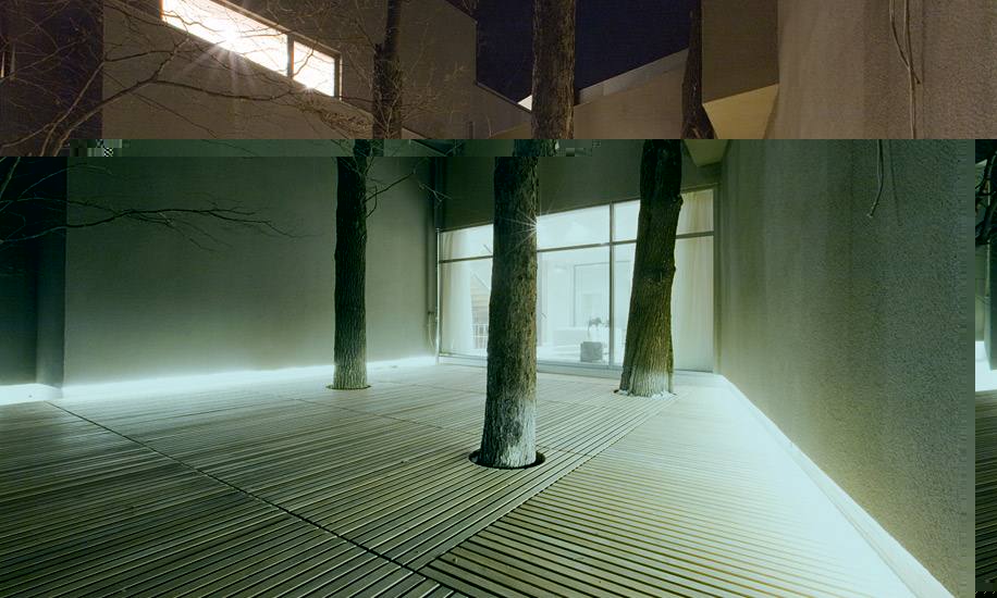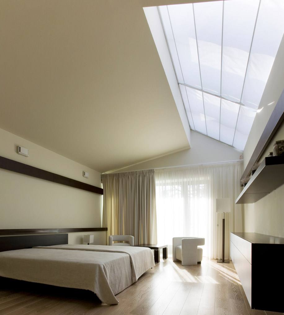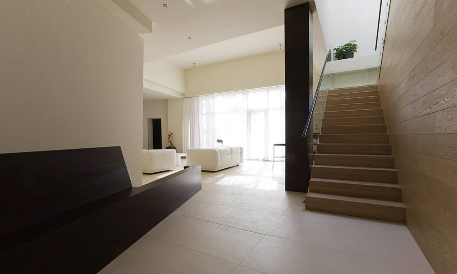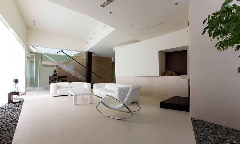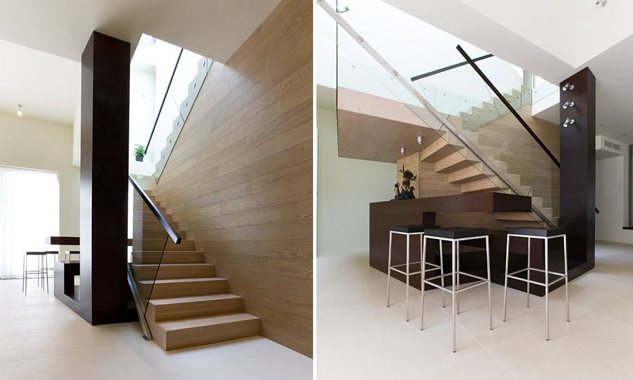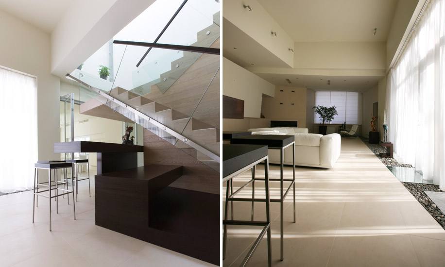 Над винным погребом, на глубине 1,2 метра, находится цокольный этаж с коммуникациями и техническим оборудованием. Первый этаж почти полностью выполнен в оттенках белого. Цветовую гамму дополняют светлый мрамор, серая речная галька, стекло и сталь. Сдержанную обстановку разбавляет черная встроенная мебель. Своим цветом она выполняет роль указателей: сложный геометрический бар, конструктивно связанный с несущей колонной, стоит рядом с лестницей на второй этаж, а черная скамья – возле ступеней к винному погребу.