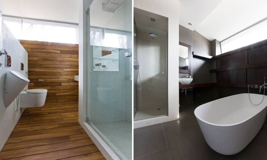 На втором этаже больше домашнего уюта: дубовый пол, ткань пастельных тонов, обитые тканью кресла. Даже панели из темного тика и ванная в стиле минимализм не нарушают теплую атмосферу.