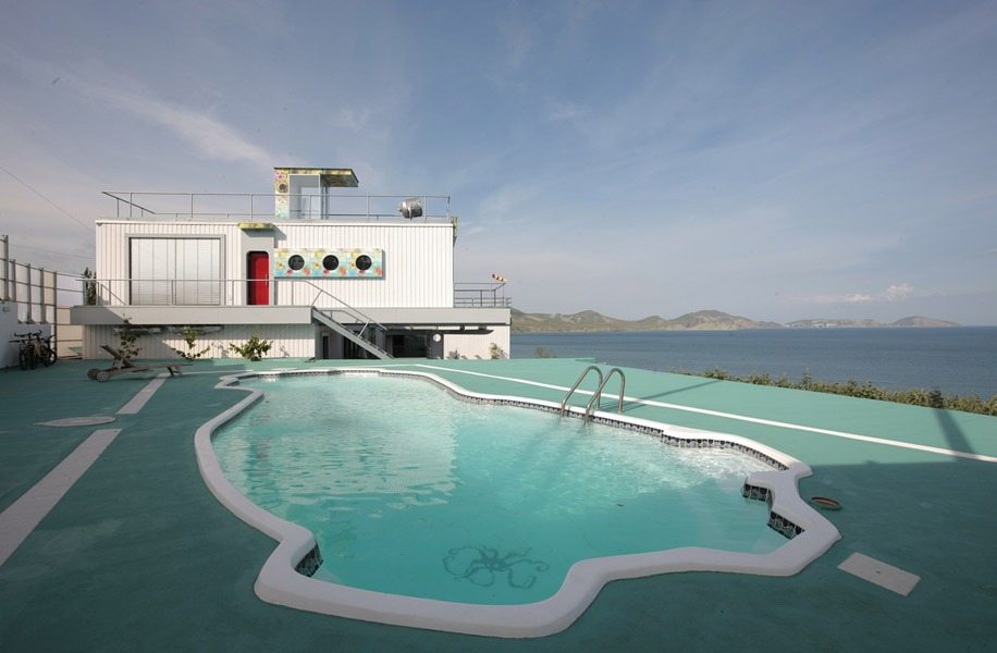 Отапливаемая площадь двухэтажного дома, состоящего из нескольких объемов, 150 кв. метров. К основному строению примыкают патио и открытый бассейн. Внутри — гостиная, совмещенная со столовой, кухня, холл и пять спален в виде корабельных кают, каждая с собственной ванной комнатой. На крышу, с которой открывается обзор на долину, можно подняться на стеклянном лифте.