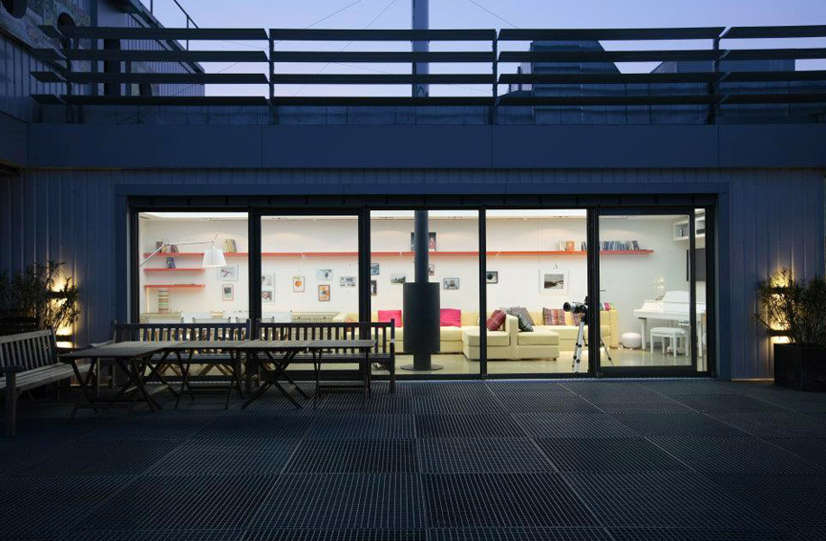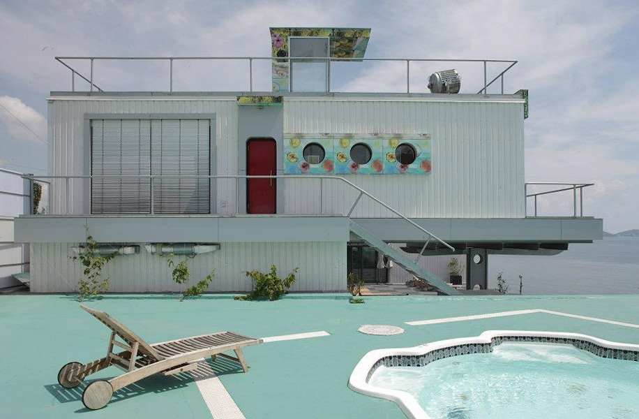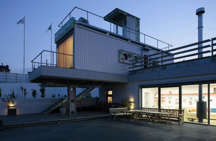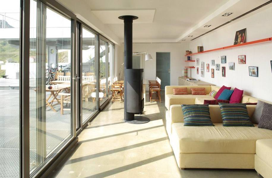 Из-за ненадежного грунта архитекторы построили двухэтажных дом из легких металлических конструкций и сэндвич-панелей. Комнаты оформили в виде кают, а в гостиной установили стеклянные раздвижные двери, которые, если их открыть, превращают пространство в летнюю террасу.