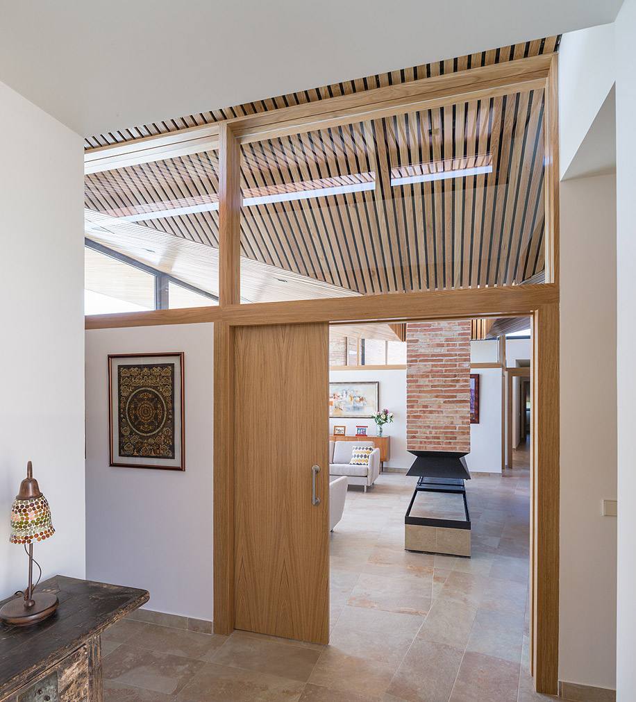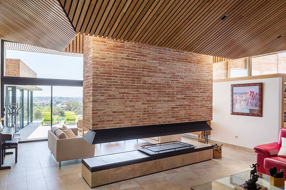 В центре жилой зоны, которая выходит на солнечное патио, находится подвесной камин, разделяющий комнату на две части. В полдень естественный свет и крыша со стоками для дождевой воды превращают камин в своеобразную лампу, освещающую центр гостиной. Спальни находятся в двух разных помещениях на возвышениях, откуда открывается вид на местный пейзаж.