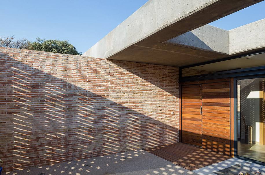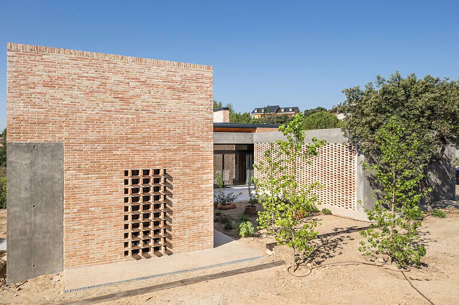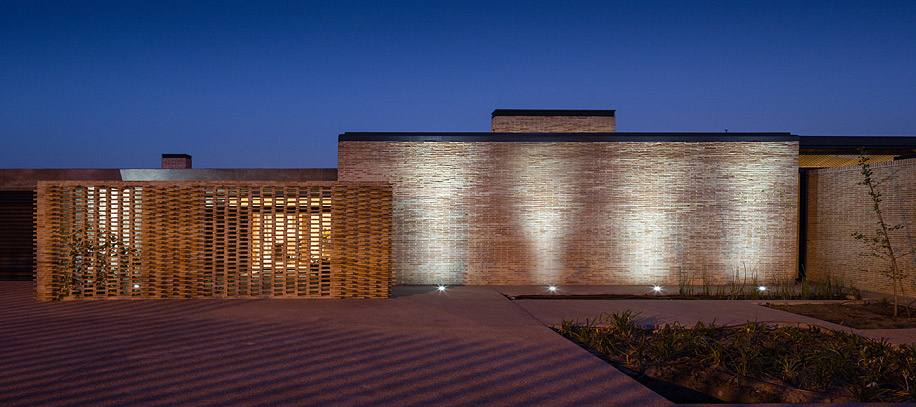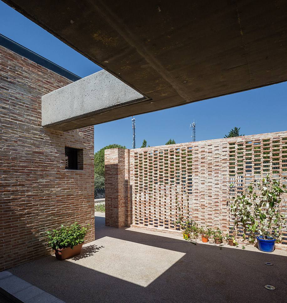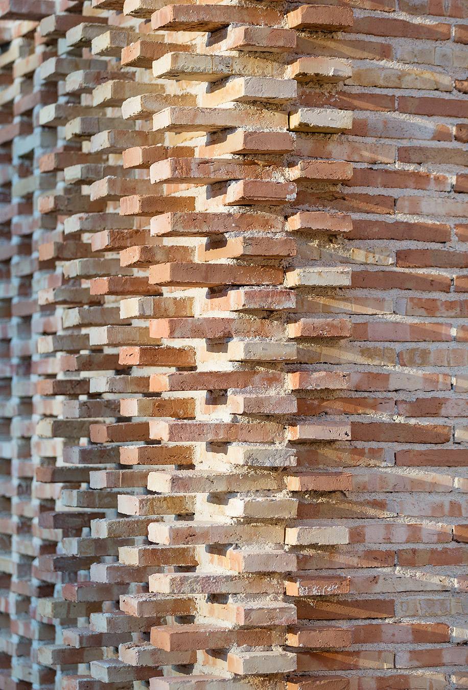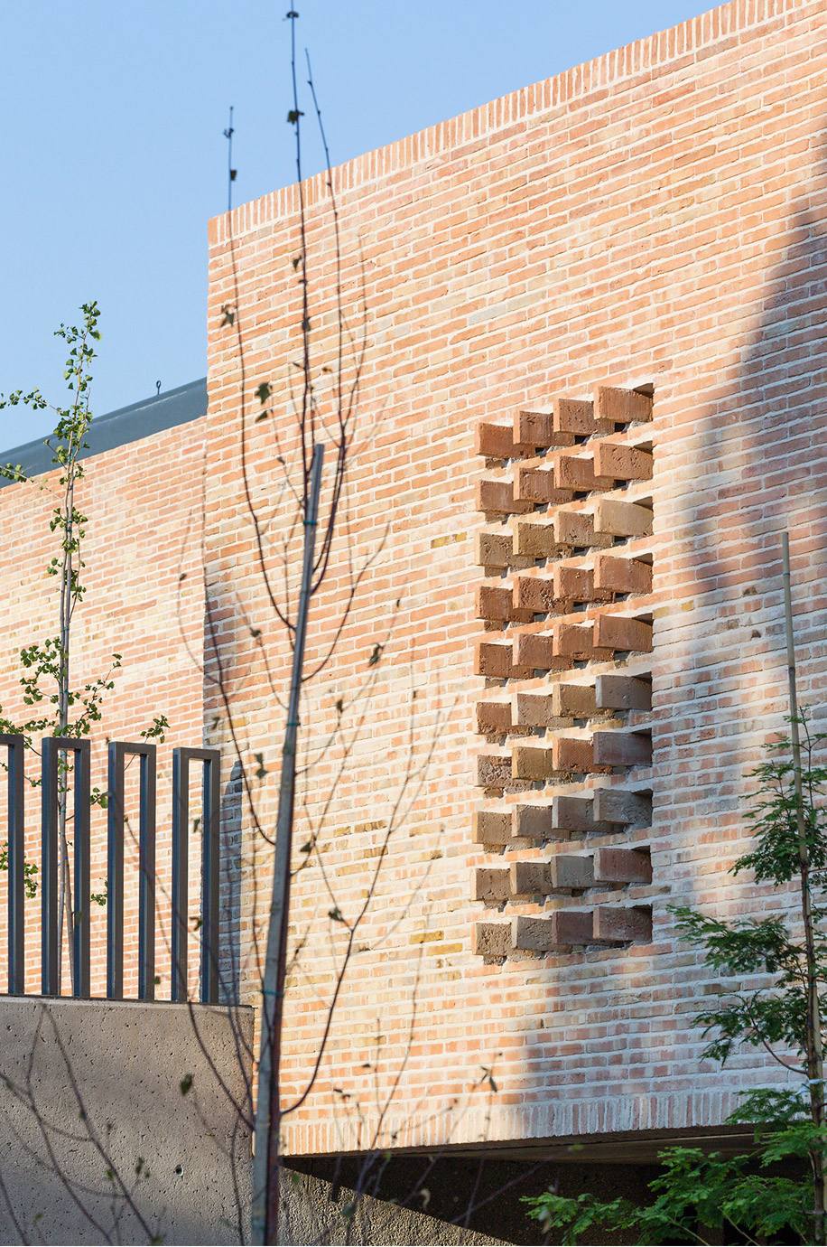 С улицы кирпичная кладка выглядит как сплошная стена, изредка прерываемая перфорациями из того же кирпича.