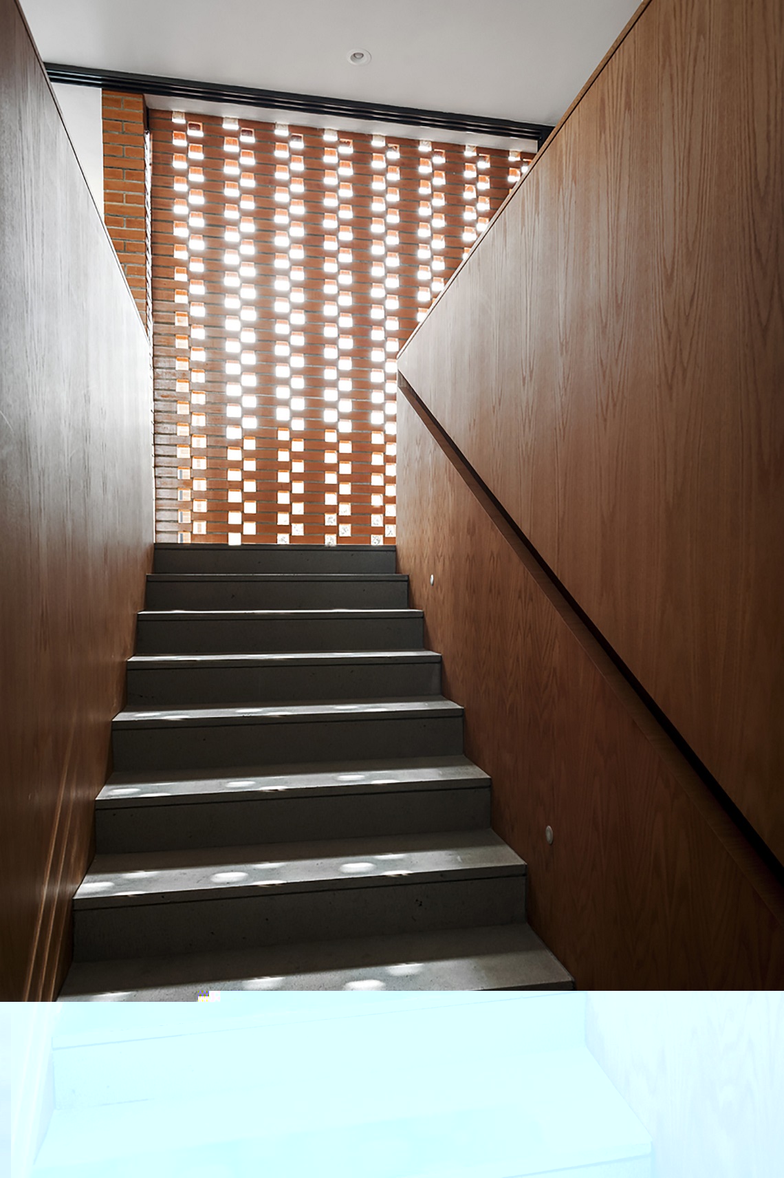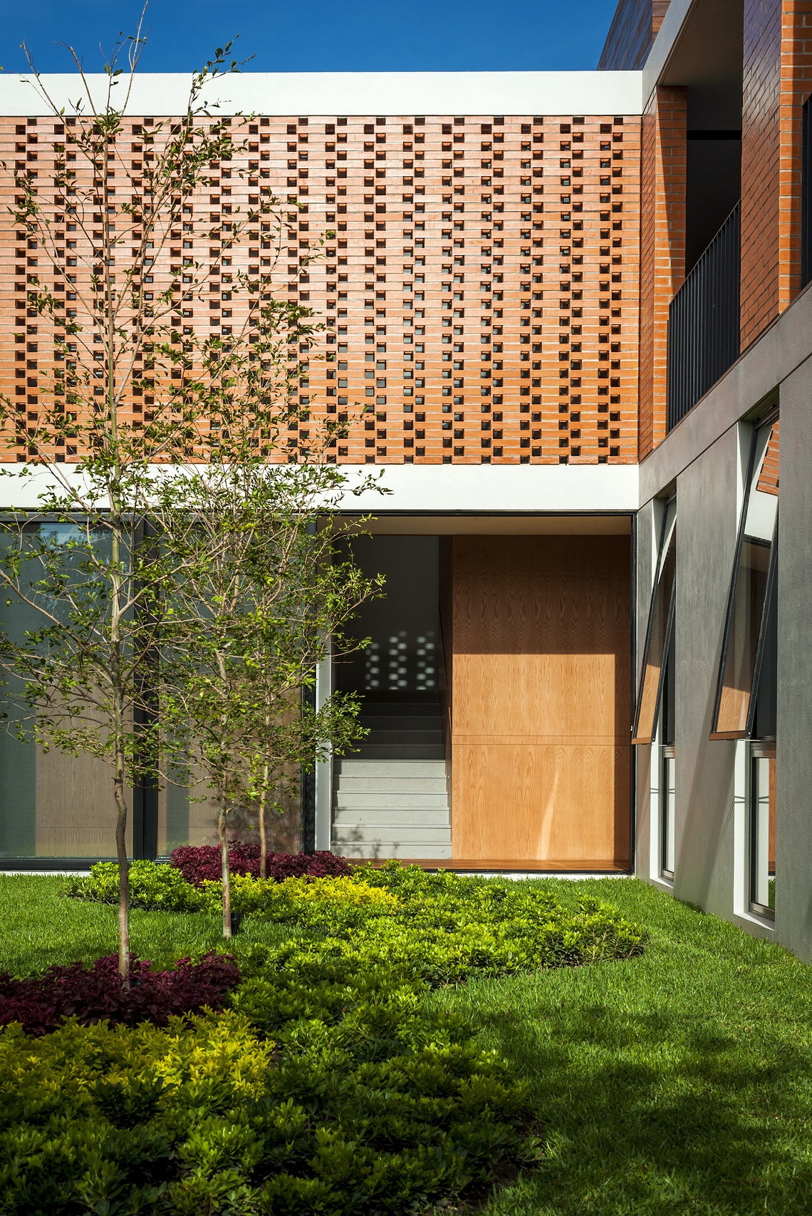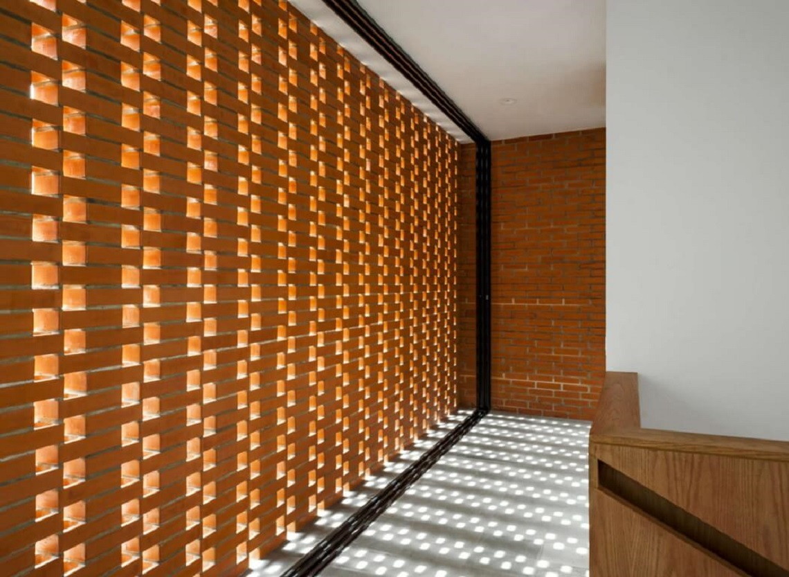 Фасад выполнен из кирпича. Использование разных видом кладки позволило архитекторам провести границу между общественной и частной зонами. Кроме того, свет, попадающий в помещения через «кружевной» узор, создает особую атмосферу внутри.