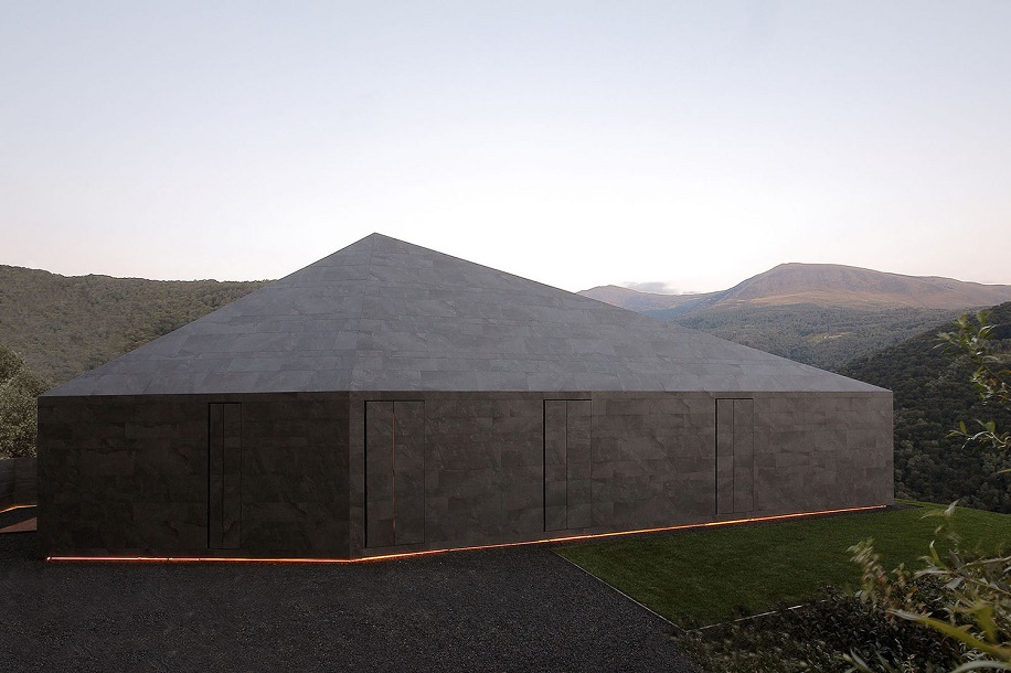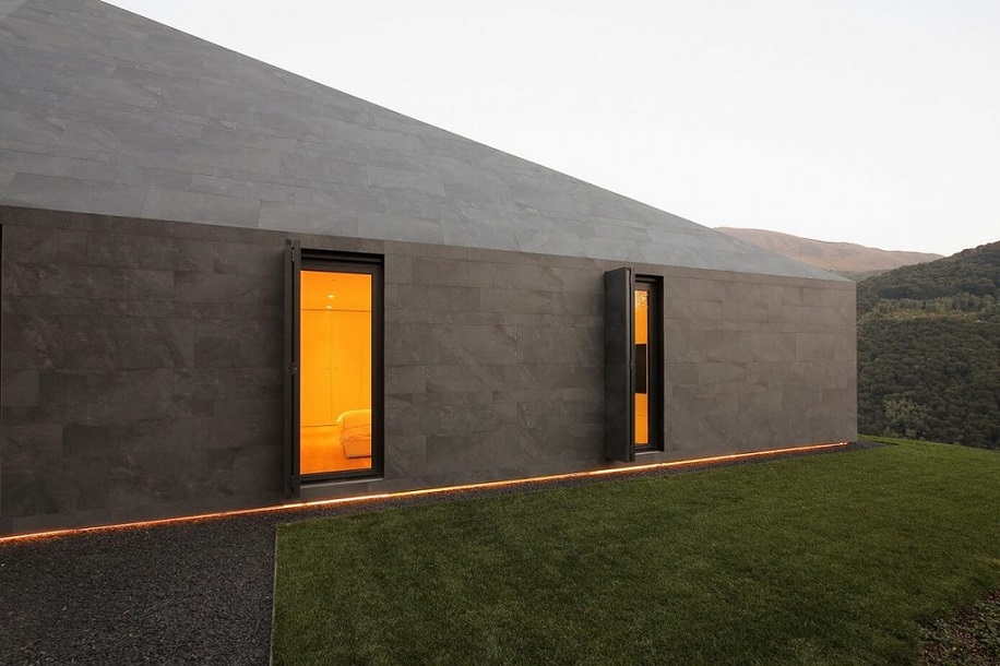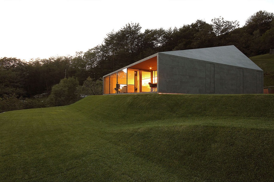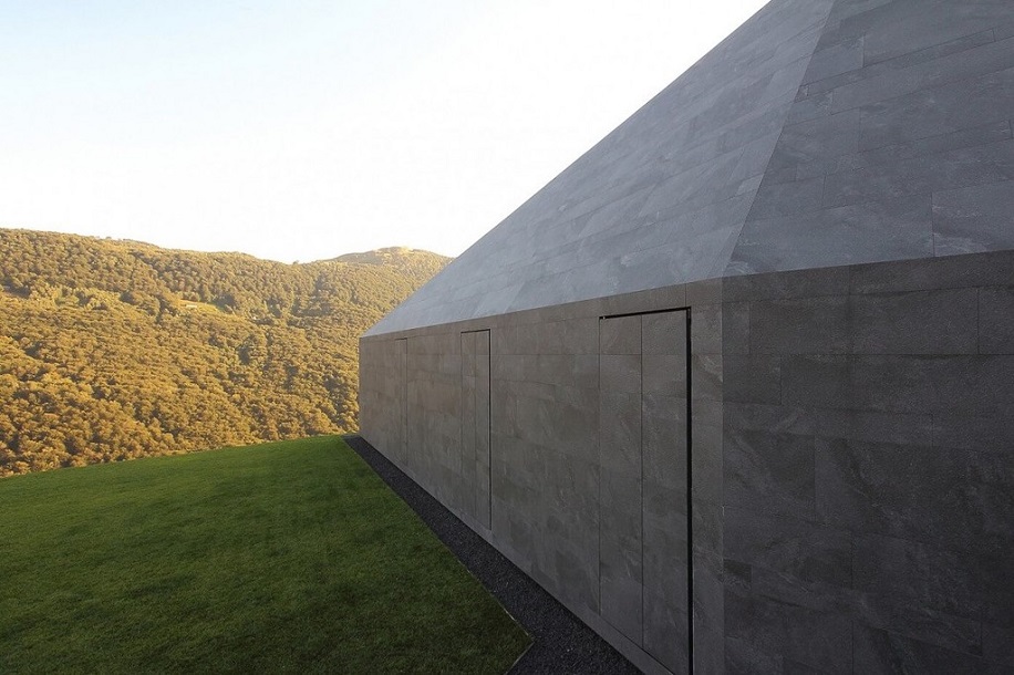 Мы превратили ограничение в благоприятную возможность. Идея состояла в том, чтобы использовать один материал – керамические листы – для кровли и фасадов, чтобы придать зданию монолитный облик. Облик валуна посреди природы. За одним исключением: южный фасад – это окно, из которого открывается захватывающий вид на долину с нетронутыми пейзажами.