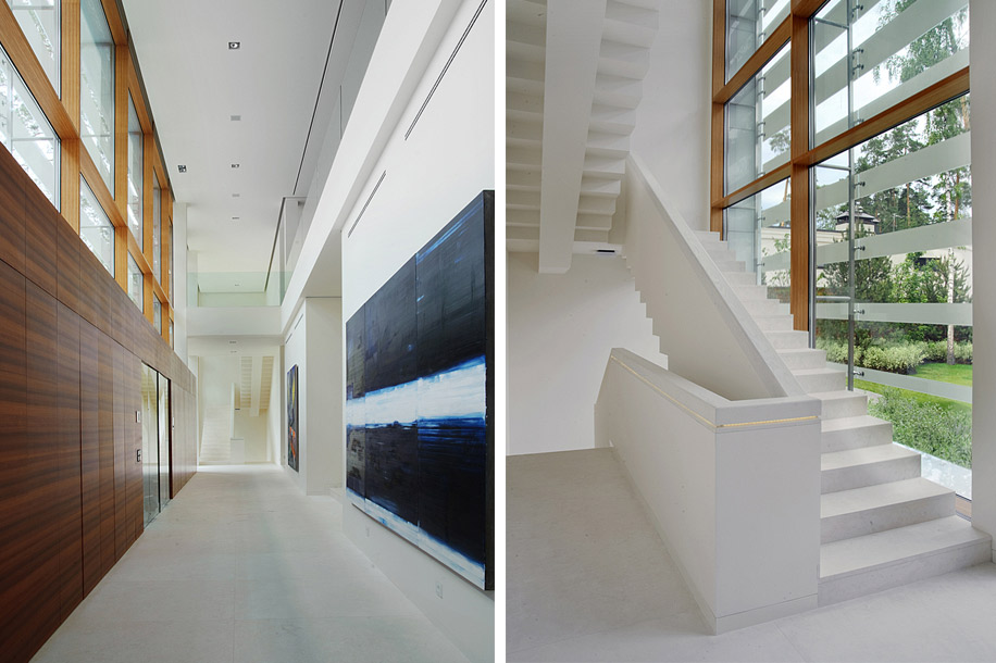 Здания состоят из одних прямых линий. Дело не только в прямоугольной форме: ощущение усиливает фасад-жалюзи из белого полупрозрачного стекла, швы облицовочных плит, полосы деревянных панелей и рамы окон. Единственная неровность – шероховатый известняк, но даже в нем отчетливо видны горизонтальные направляющие.