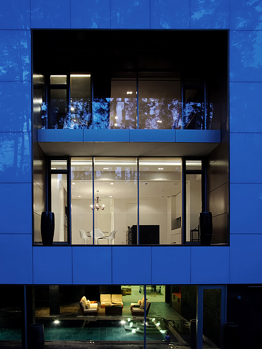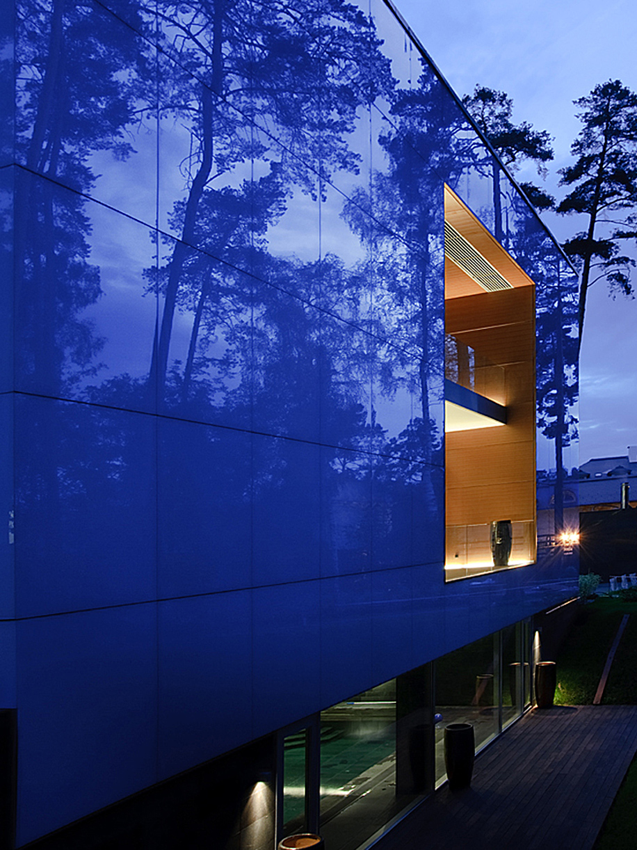 На участке 0,5 га в поселке «Сады Майндорфа» находятся три строения одинаковой длины: главное здание общей площадью 1398 кв. м, гаражный блок с котельной и комнатой охраны и баня с открытым бассейном. Каждый из объемов имеет свой цвет, заданный отделочным материалом: белый эмалит жилого дома, черный сланец гаража и красный кедр бани.
