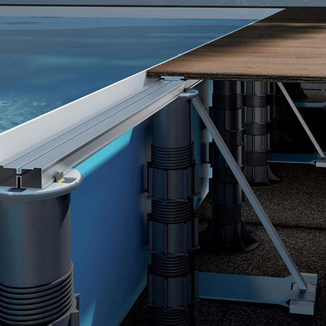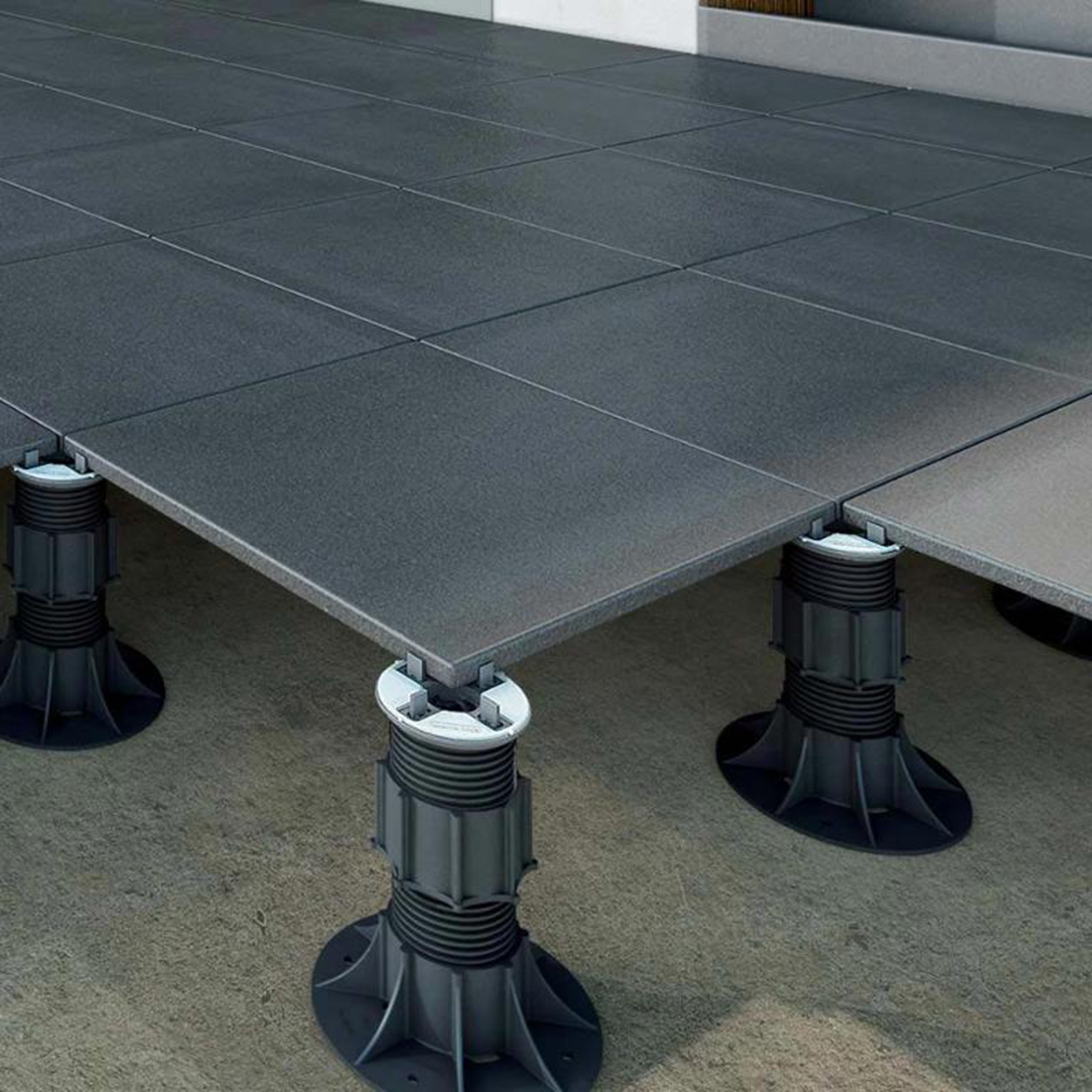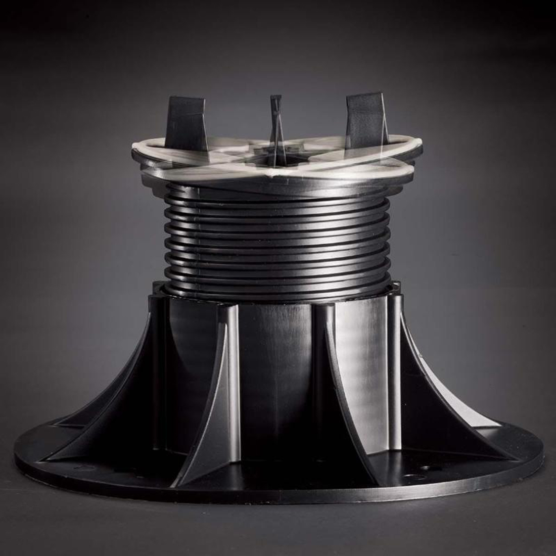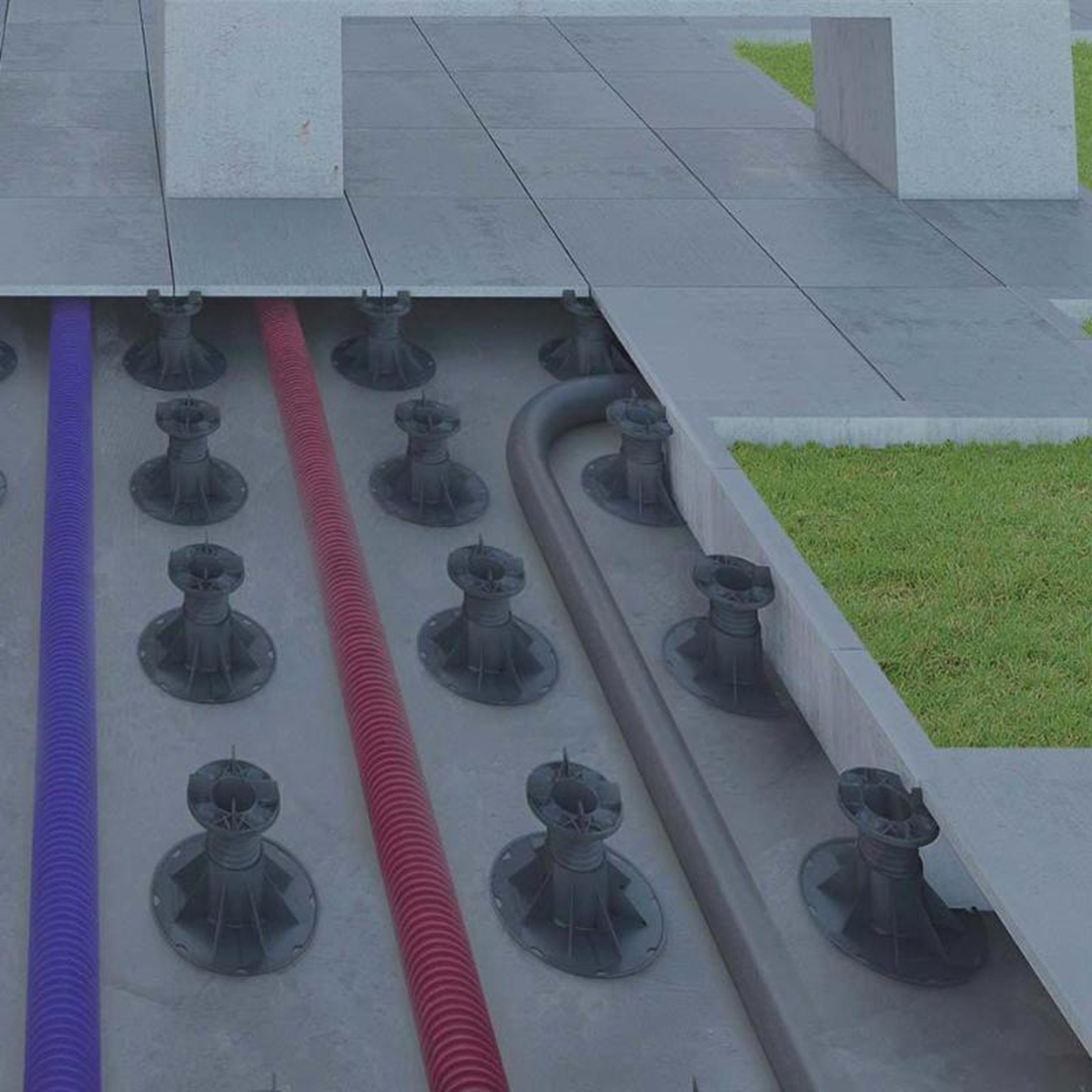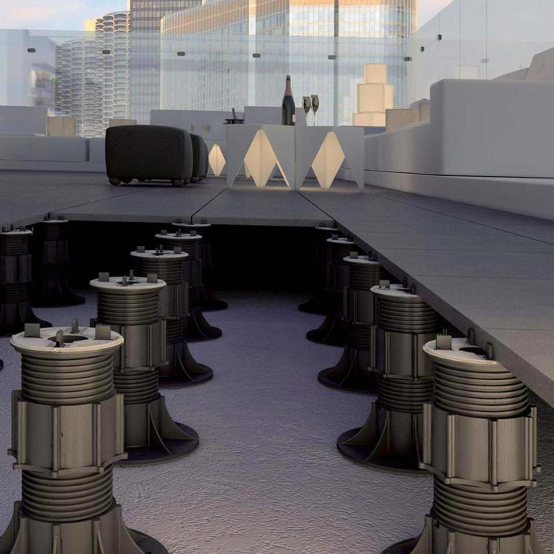 Эксплуатируемая кровля предполагает уклон для стока воды. Однако итоговая поверхность должна быть плоской. Кроме того, необходимо спрятать все коммуникации. Винтовые опоры позволяют регулировать угол наклона и в определенных точках поднять террасный настил на нужную высоту (от 38мм до 550 мм). Таким образом, через специальные отверстия вода стекает с поверхности крыши на наклонную поверхность, тогда как сам настил лежит идеально ровно..