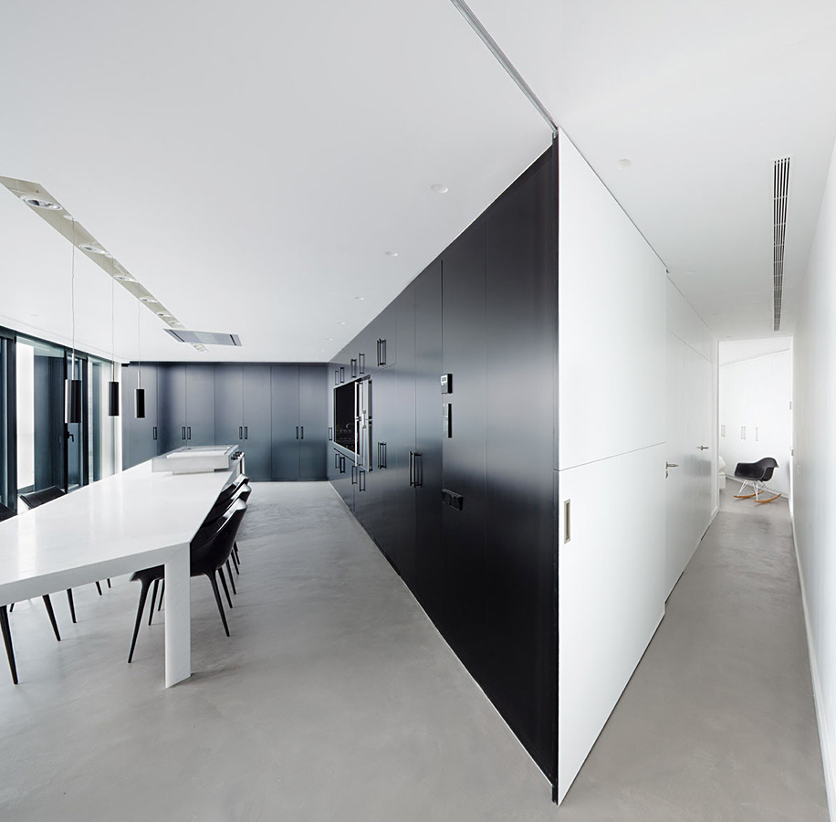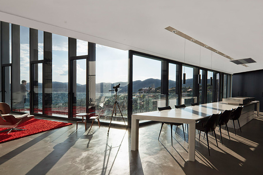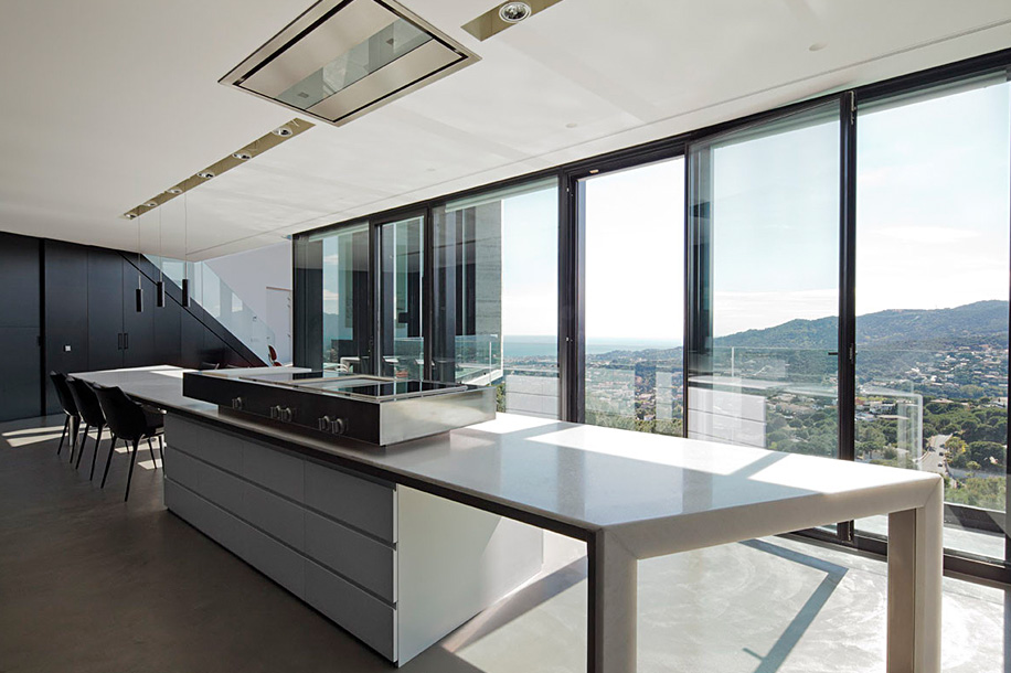 Чтобы увеличить площадь проекта, было решено врезать часть дома в холм. Первый этаж четко разделен на две части. В передней находятся двухсветная гостиная и кухня/столовая, в центре которой внушительный 8-метровый стол из мрамора.
