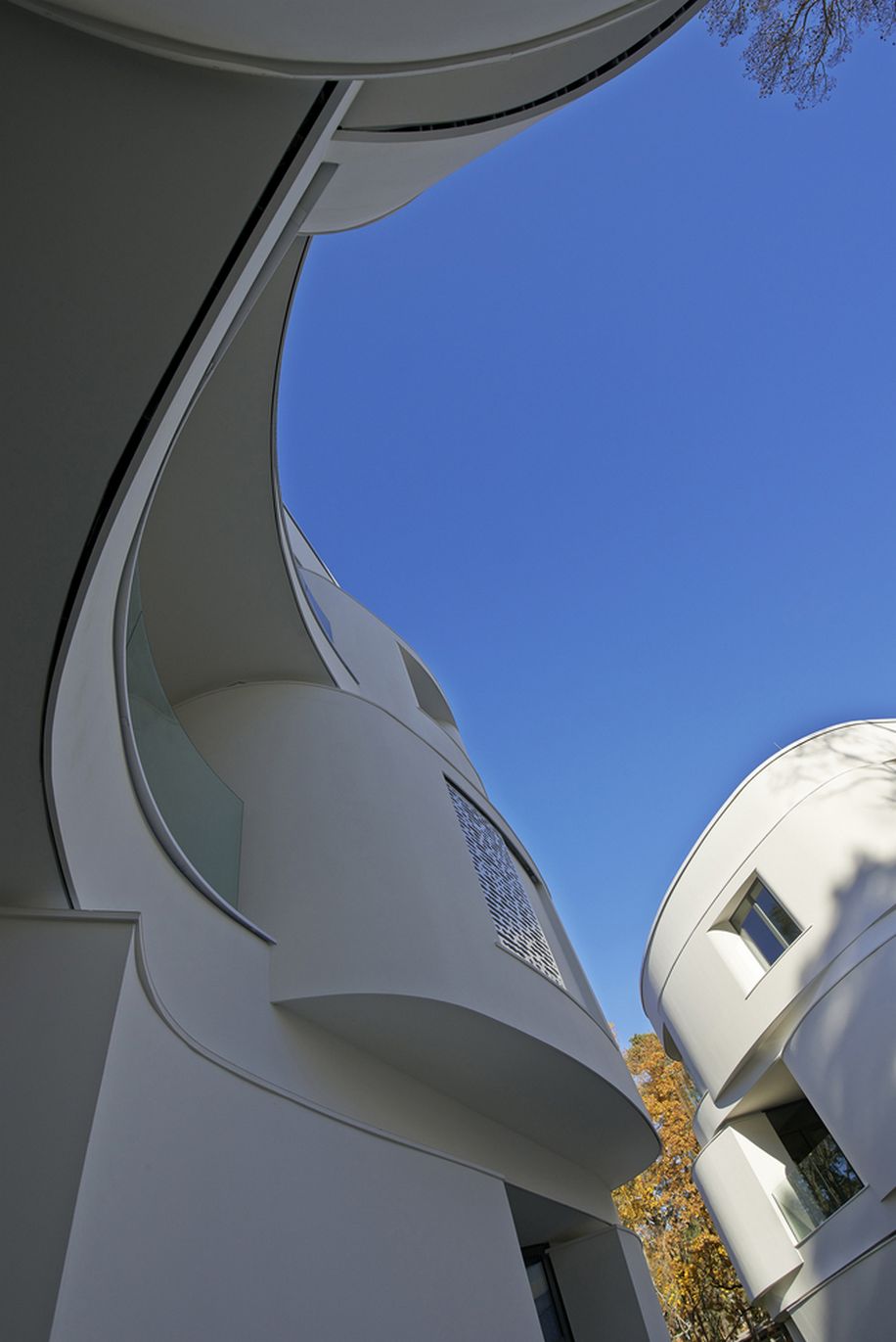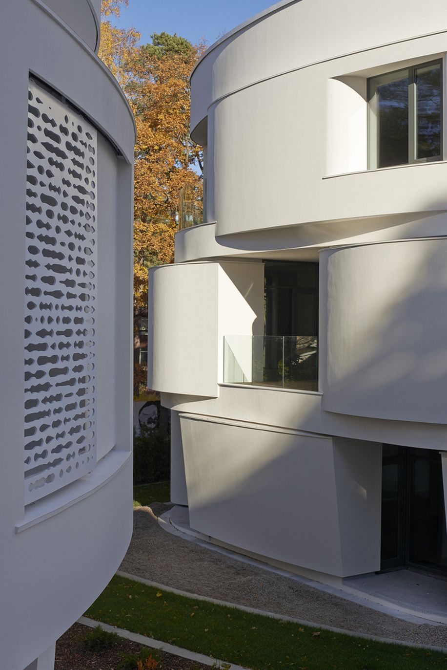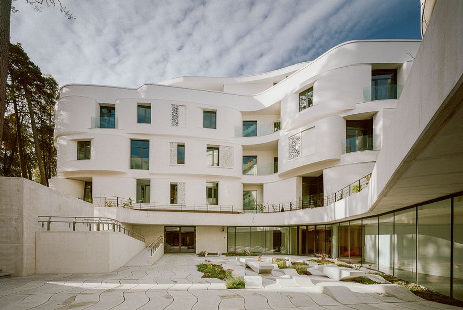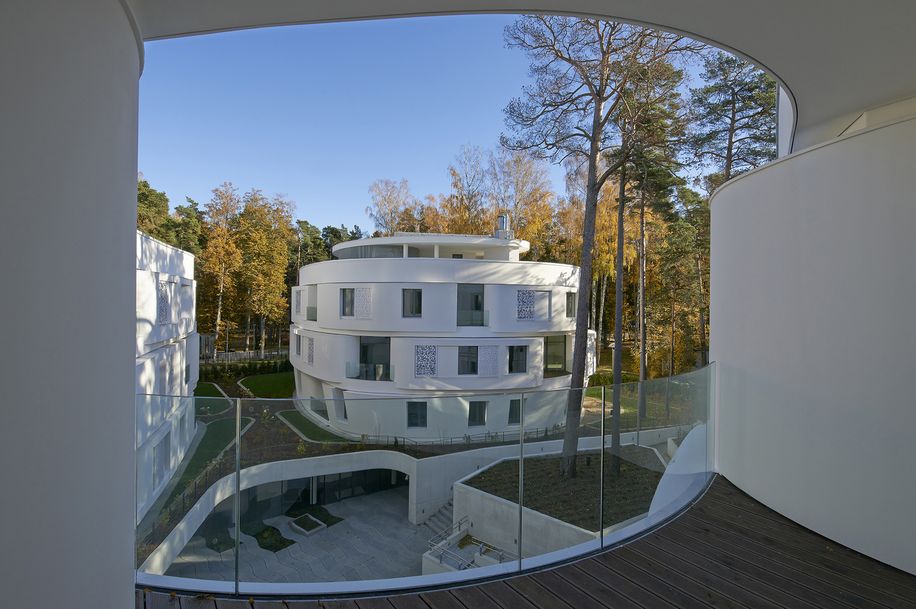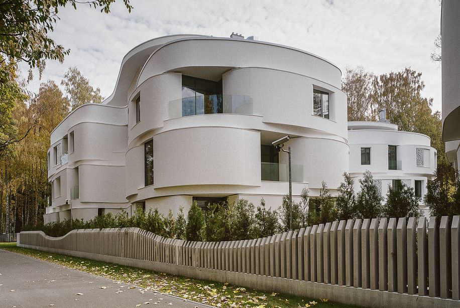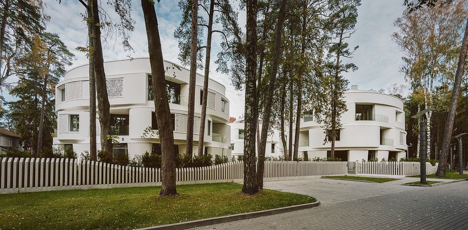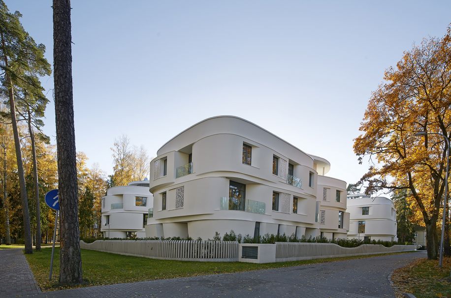 Плавные обтекаемые формы белоснежных фасадов — отсылка к светлым волнам песка на юрмальском пляже, гладкой гальке и выбеленным ракушкам. Форма мотивирована не только эстетичностью облика зданий, но и удобством: изгибы фасада скрывают друг от друга соседние окна и балконы и тем самым обеспечивают жильцам приватность.