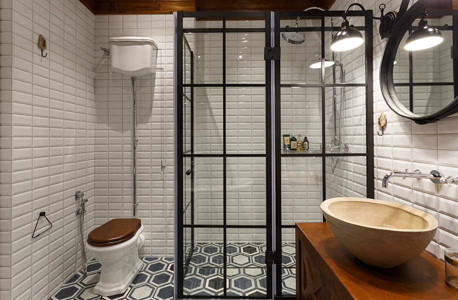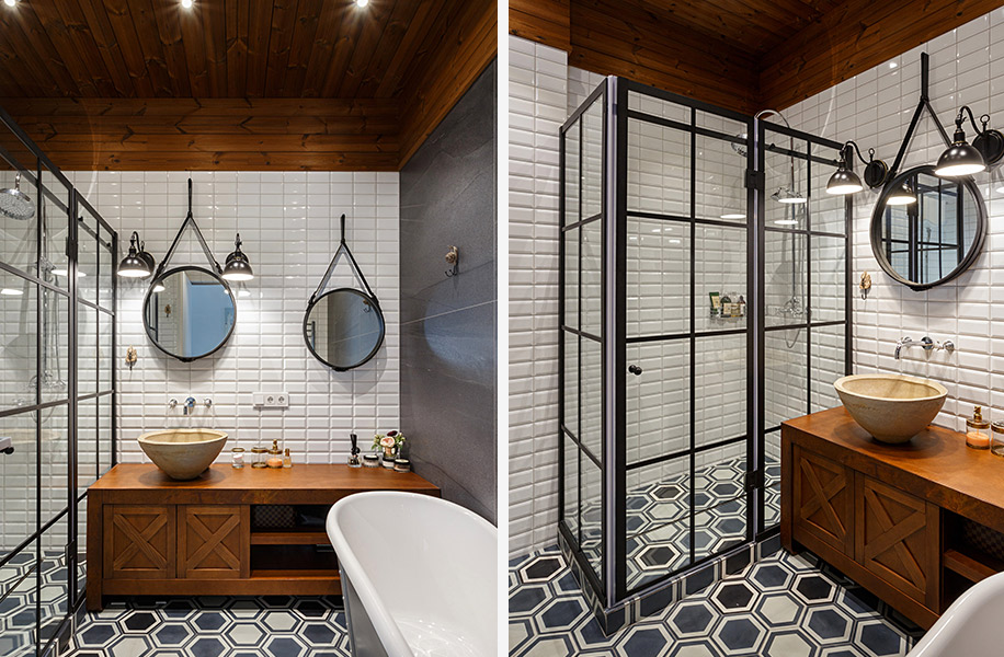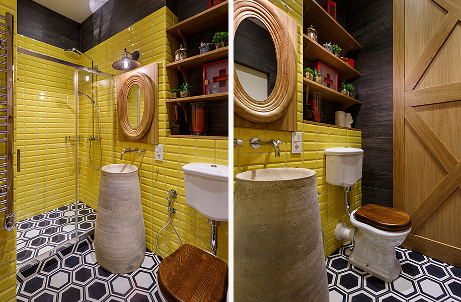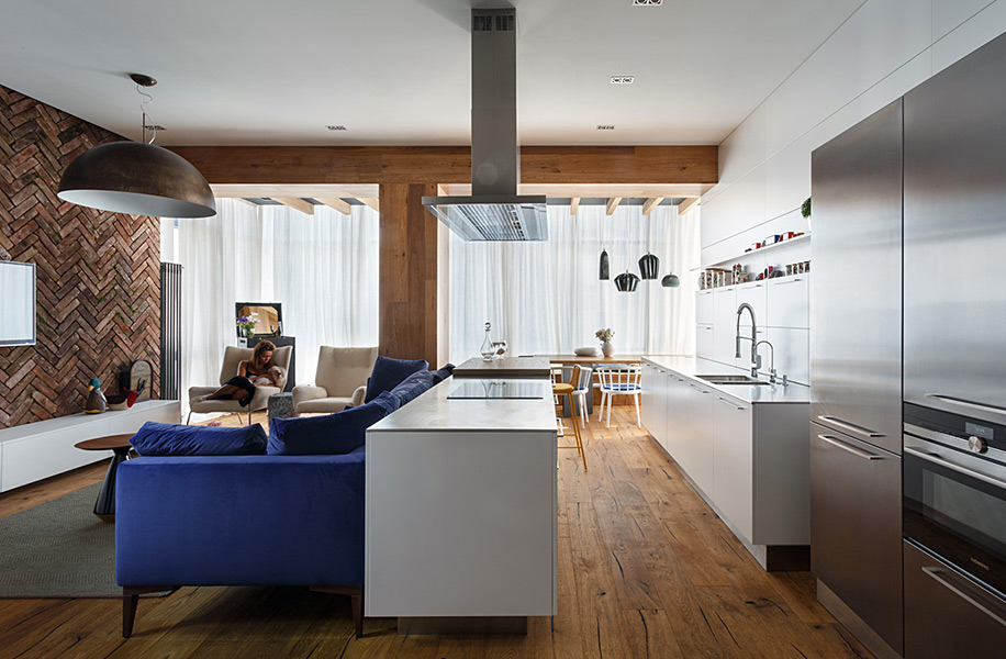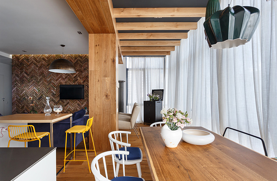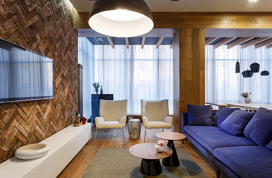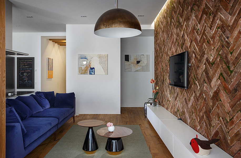 Квартира площадью 110 кв. м включают гостиную-студию, кухню и столовую, а также две спальни и два санузла, техническое помещение. Эффектное решение в оформлении гостиной — стена, декорированная екатеринославским кирпичом ручной формовки местного производства.