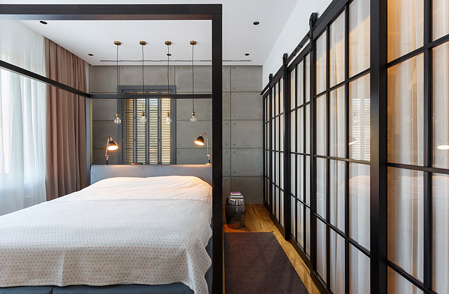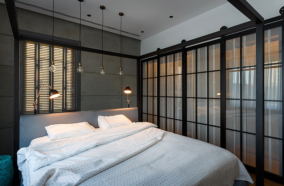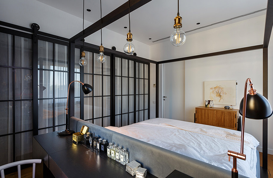 Хозяйская спальня компактная, но многофункциональная: здесь две гардеробные зоны, а за изголовьем кровати располагаются туалетный столик и рабочее место.