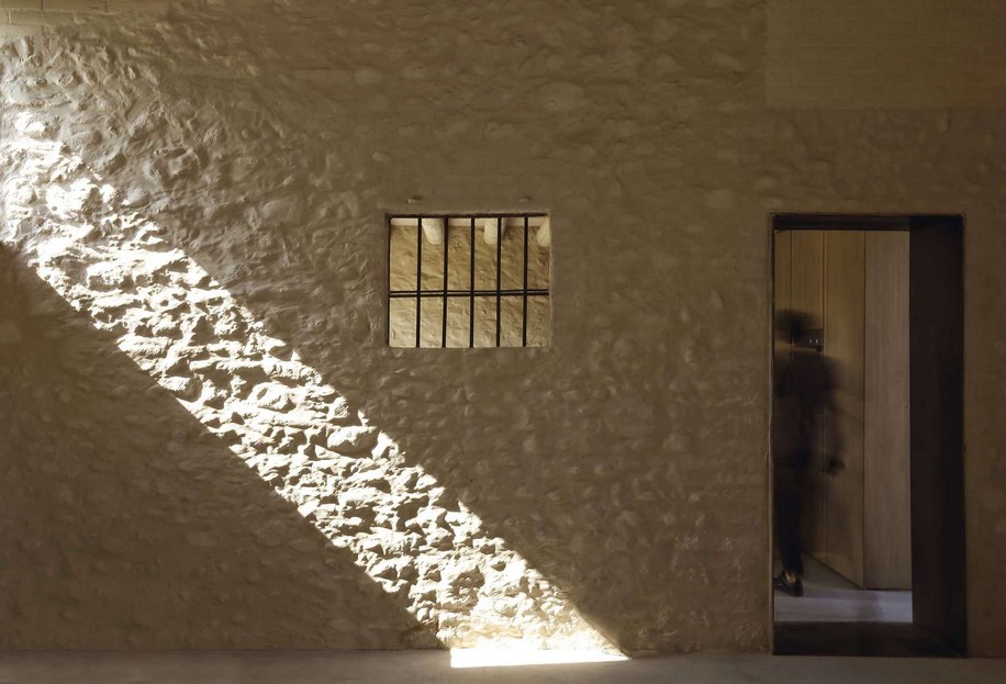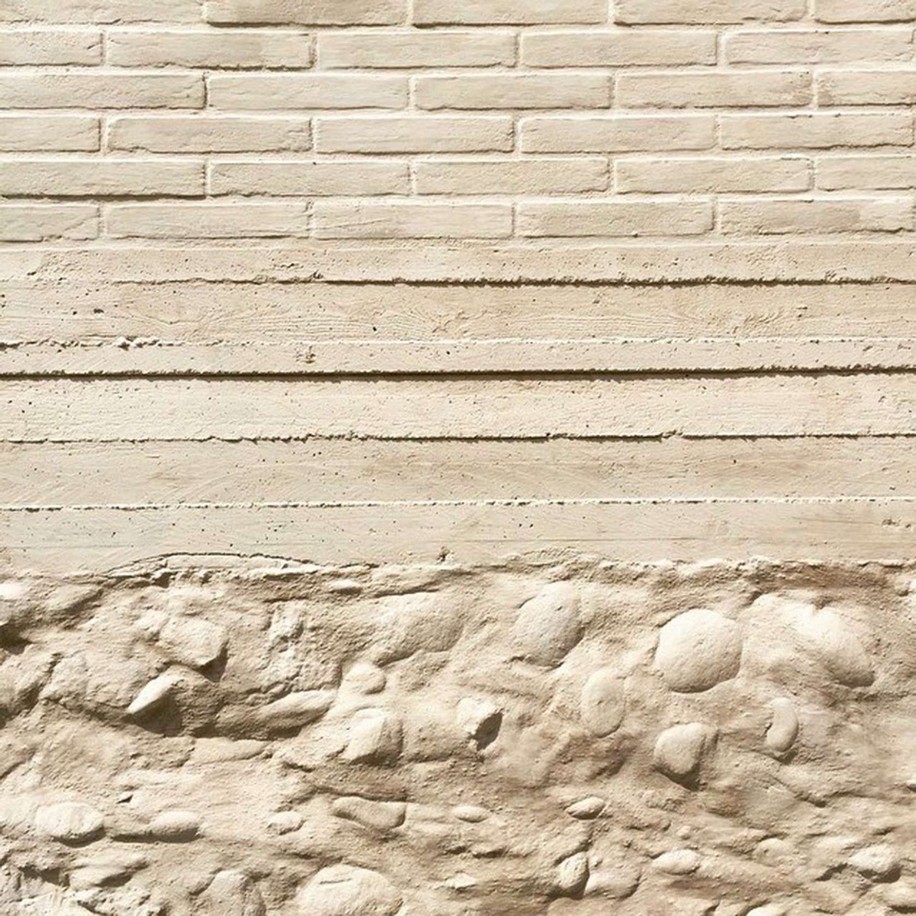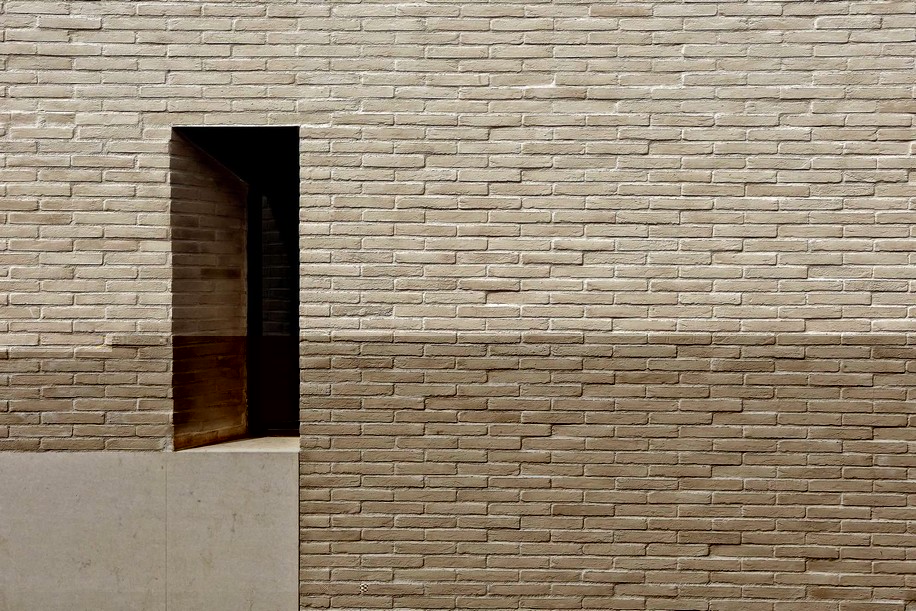 Другой контраст возник между линейной кирпичной кладкой и грубой каменной стеной. Чтобы его сгладить, архитекторы клали кирпич в случайном порядке, создавая асимметричные углубления с небольшими выпуклыми и вогнутыми углами. Так на кирпичной поверхности удался эффект перемещения света из-за присутствия легких теней на всей стене.