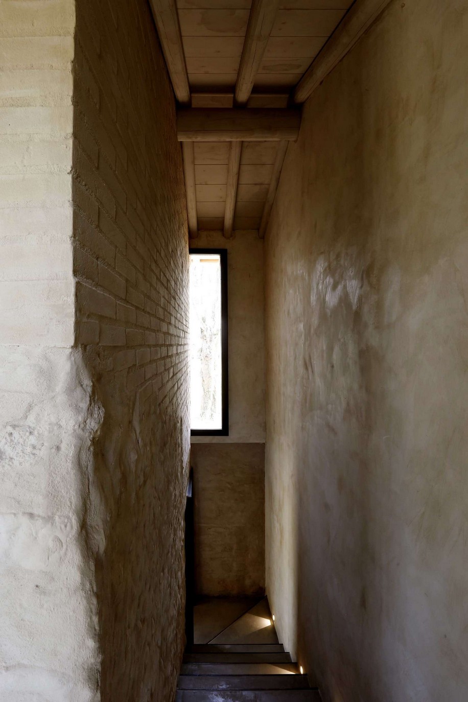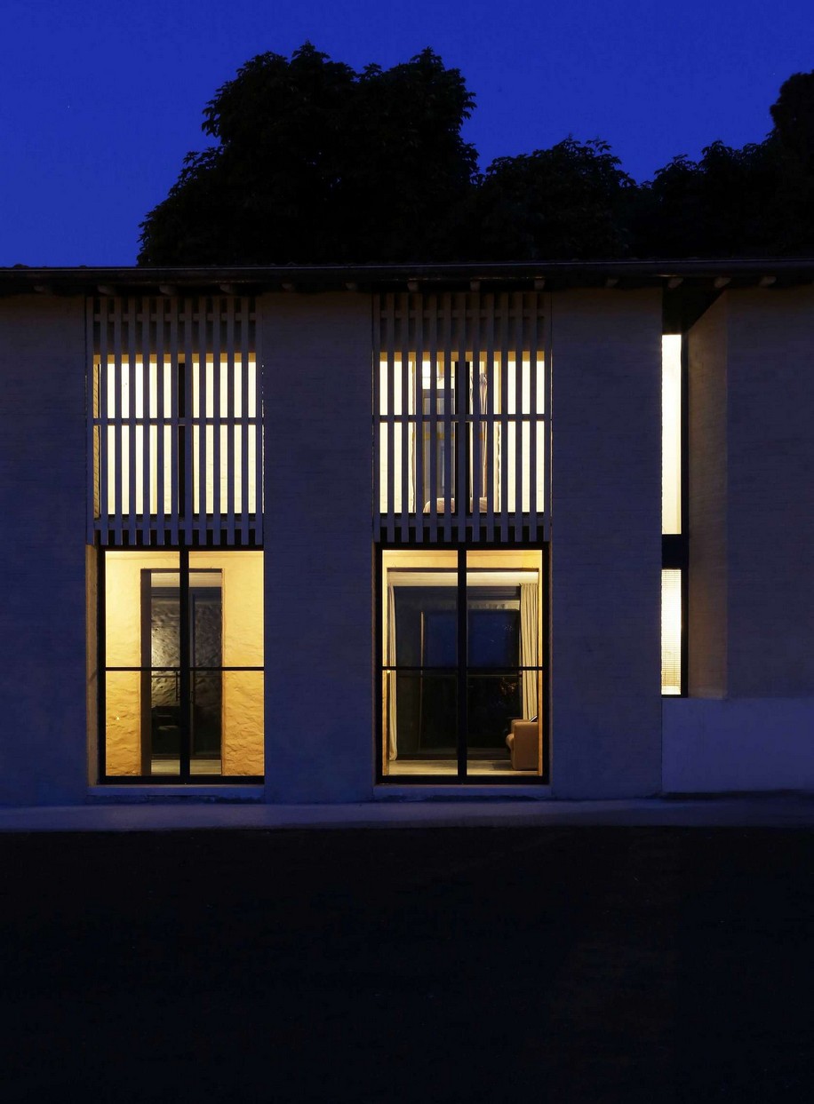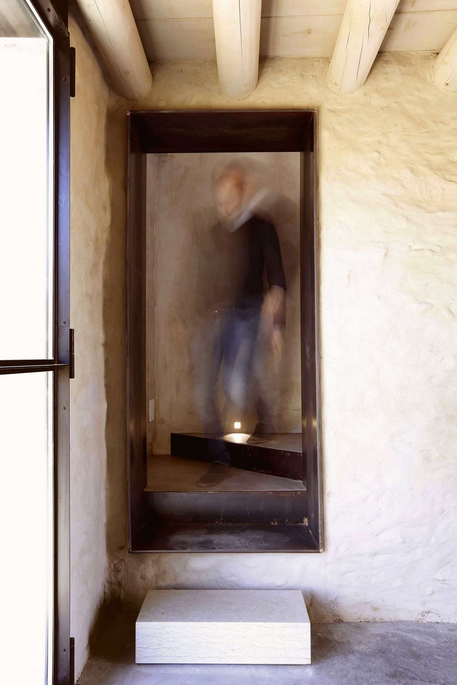 Более низкая часть пристройки включает просторную (с окнами на два уровня) гостиную с выходом к бассейну. Это единственное место, где дверной проем сделан в оригинальных каменных стенах. Вход прерывает полосу армированного бетона, которая идет по всему фасаду. Она служит укреплением для каменной стены и частью кирпичной кладки, выровненной с перемычкой двери.