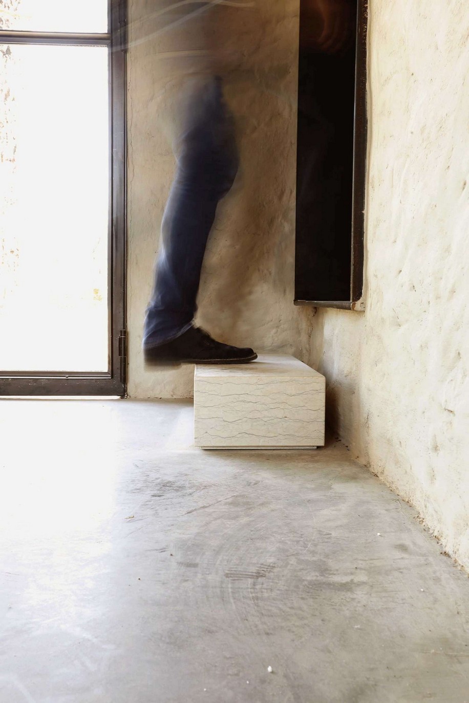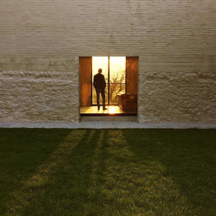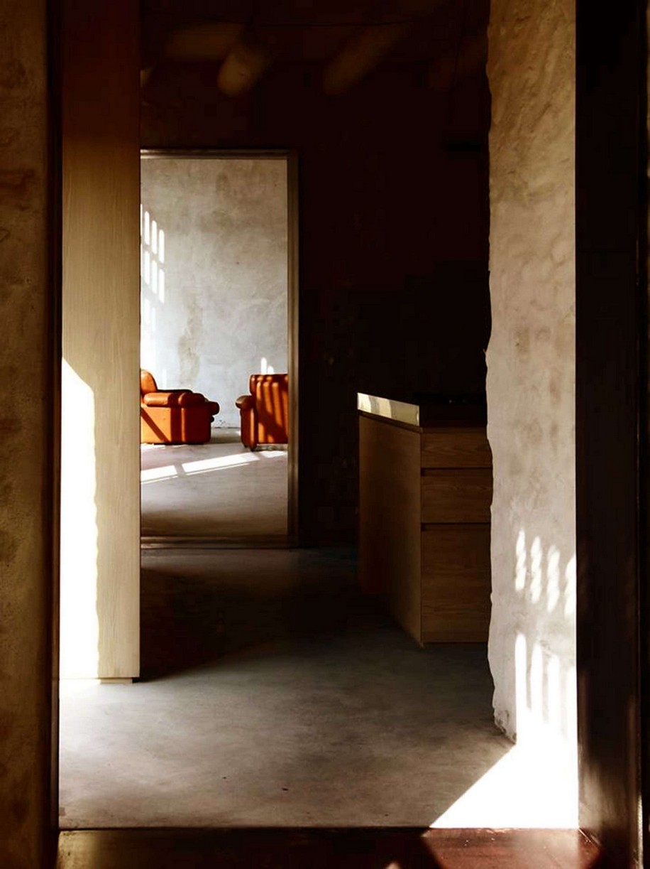 Более низкая часть пристройки включает просторную (с окнами на два уровня) гостиную с выходом к бассейну. Это единственное место, где дверной проем сделан в оригинальных каменных стенах. Вход прерывает полосу армированного бетона, которая идет по всему фасаду. Она служит укреплением для каменной стены и частью кирпичной кладки, выровненной с перемычкой двери.