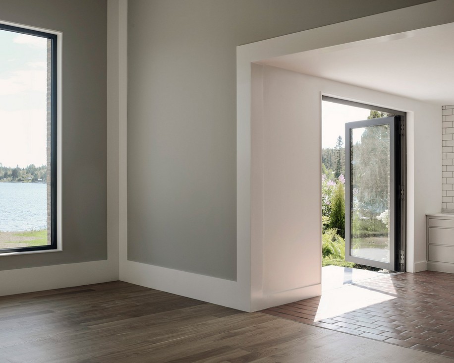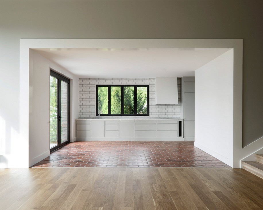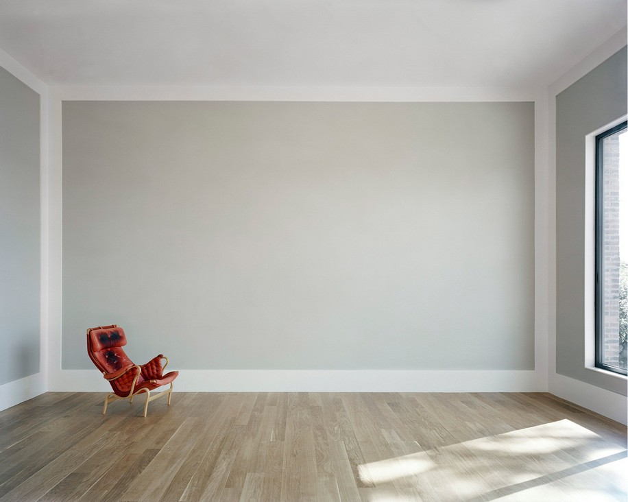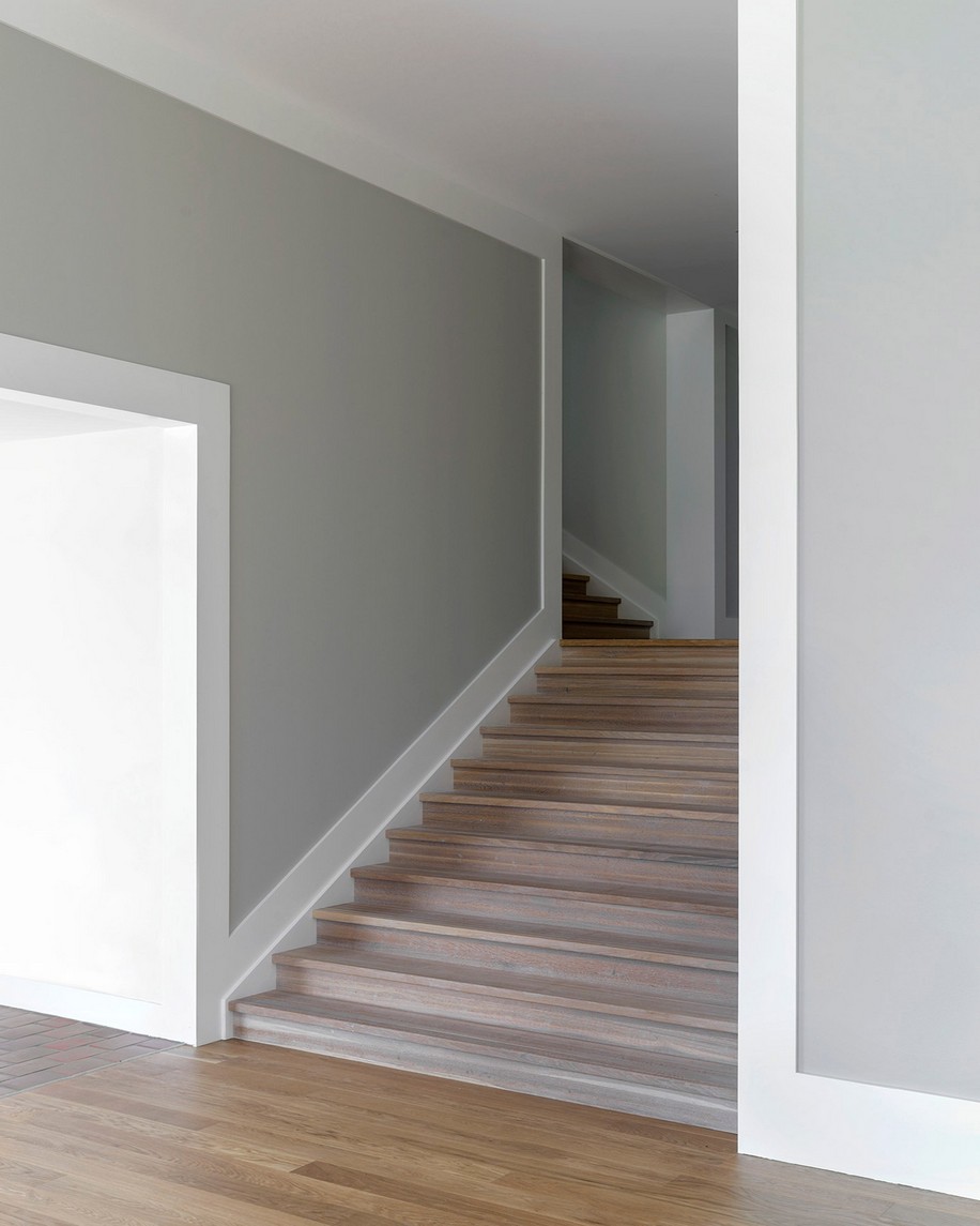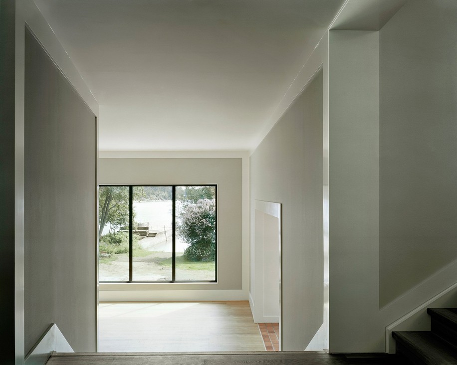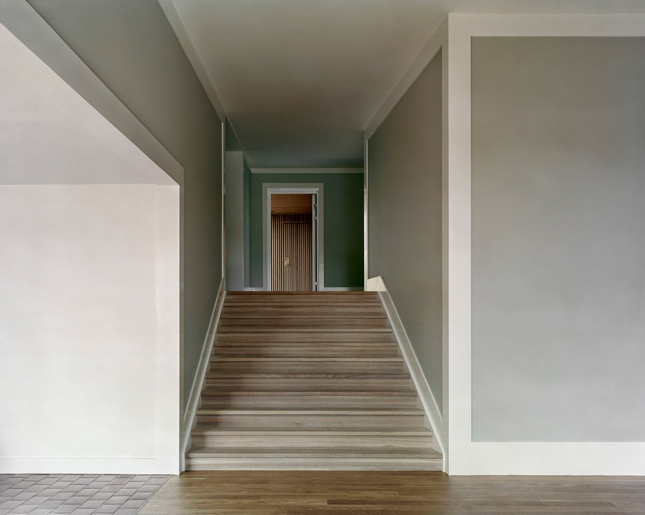 Главный вход ведет в одноэтажный зал, а оттуда лестница спускается вниз, в двусветную гостиную с видом на сад и водоем. Стены на каждом уровне окрашены в разные оттенки серого и зеленого — таким образом архитекторы хотят создать тонкое различие в восприятии пропорций комнат.