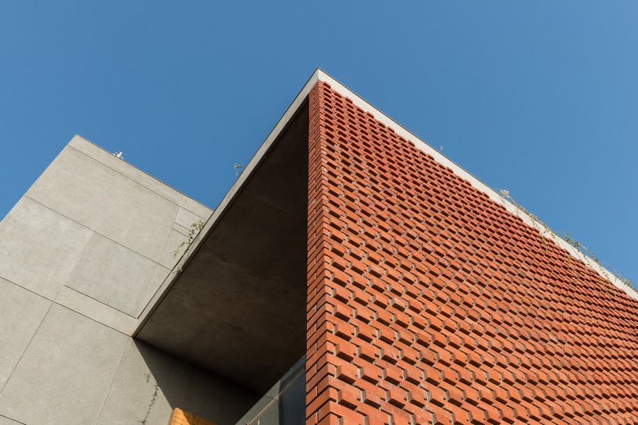 На фасад, за которым размещены общественные зоны, в течение большей части дня падают прямые солнечные лучи. Чтобы не допустить перегрева, архитекторы использовали хорошо известную в жарких странах технику — выложили кирпичную стену в объемной кладке. Выступающие кирпичи отбрасывают тень и создают дополнительную поверхность, которая поглощает тепло.