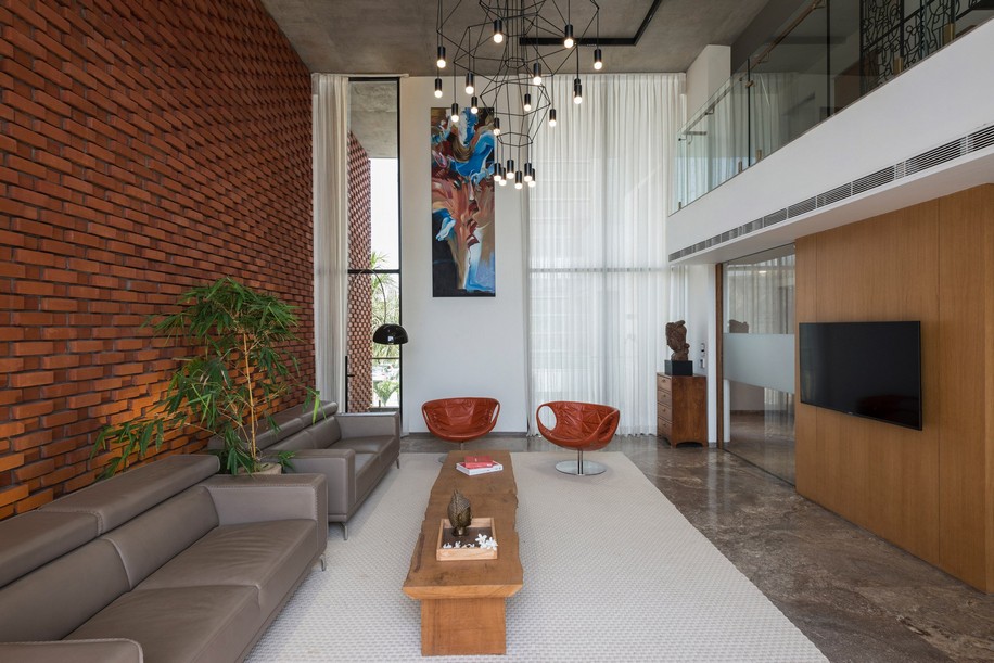 Красный кирпичный фасад в то же время служит украшением, а именно дополняет простые бетонные стены. Чтобы связать внутреннее пространство дома с кирпичной кладкой, для общественных зон выбрали мебель спокойных и теплых осенних оттенков.