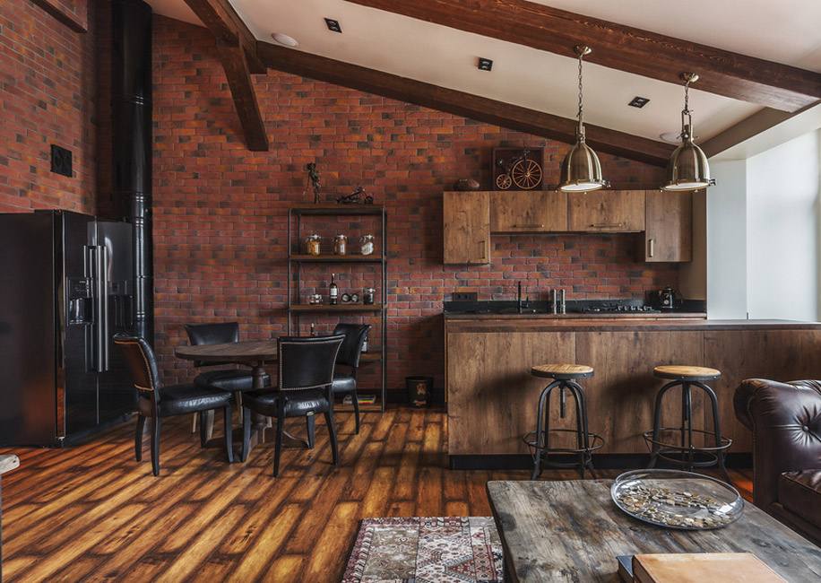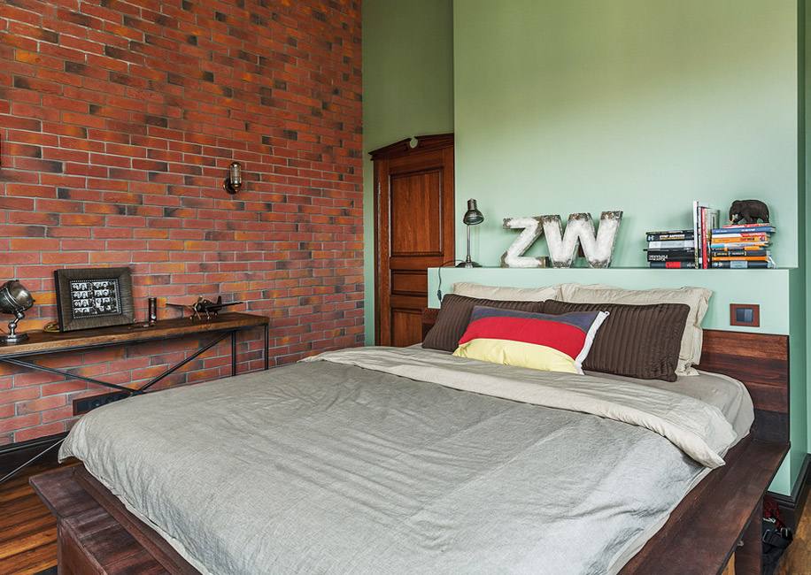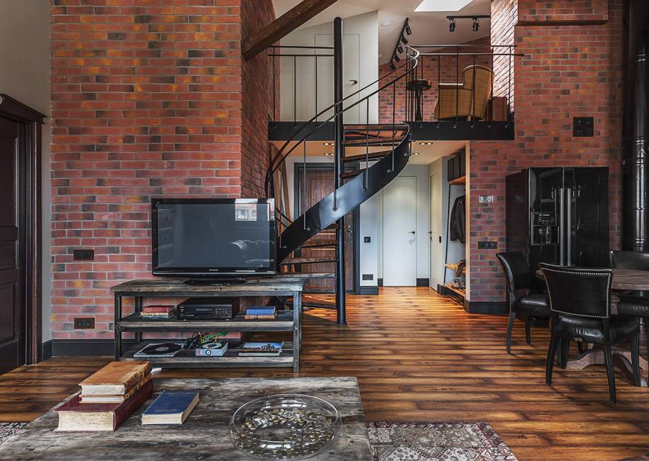 За основу дизайн-проекта была взята идея классического лофта. Чтобы создать эффект кирпичной кладки, дизайнеры из бюро Element покрыли часть стен клинкером под кирпич.
