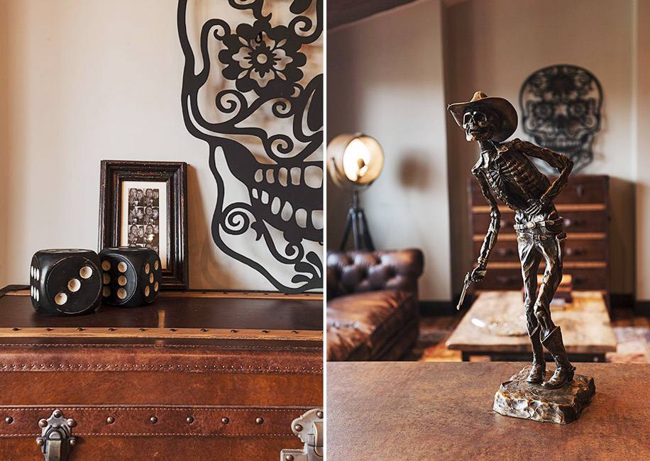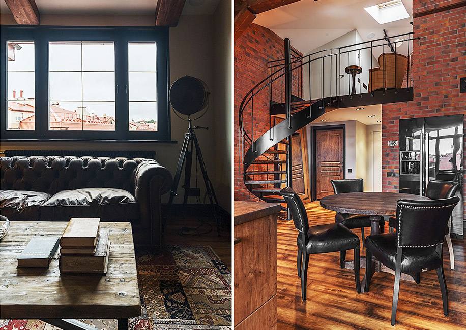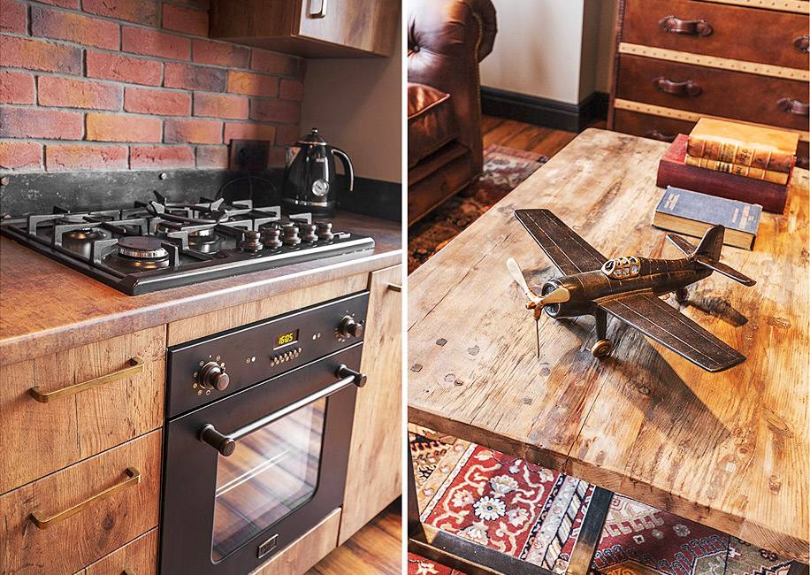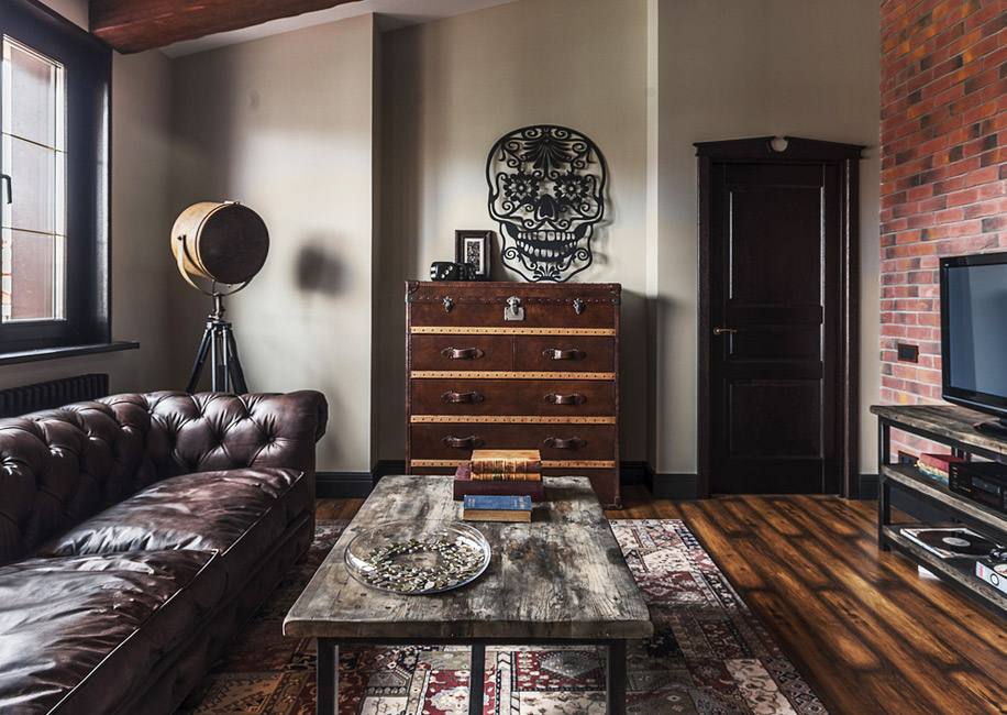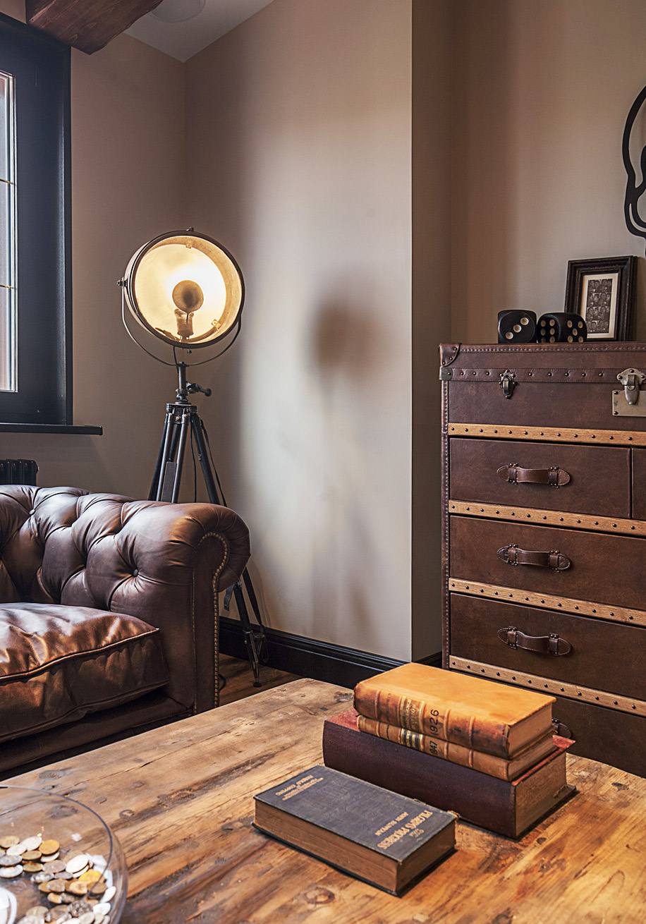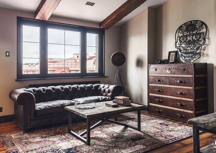В зоне кухни-гостиной сделали деревянные фальшбалки. Они добавляют интерьеру брутальности, как и фактурная мебель: кожаный диван Kensington, журнальный стол с шероховатой деревянной столешницей, комод, похожий на старинный чемодан.