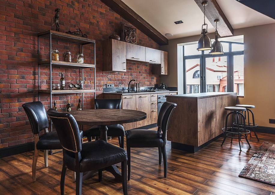 Для зоны столовой выбрали массивный круглый стол и черные стулья из кожи с заклепками.