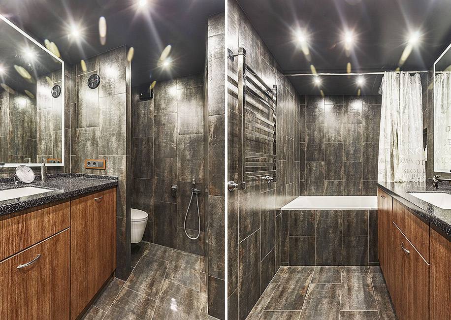 Стены в спальне покрасили в пыльно-зеленый. Для ванной комнаты выбрали темную плитку. Её использовали и на полу, и на стенах.