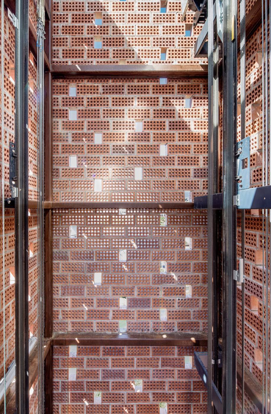 Отверстия служат не только вентиляцией, но и создают интересную игру света. Благодаря проникающему через них свету пассажиры могут увидеть красную глиняную поверхность. Кроме того, пористость кирпичной кладки создает общее ощущение легкости конструкции.