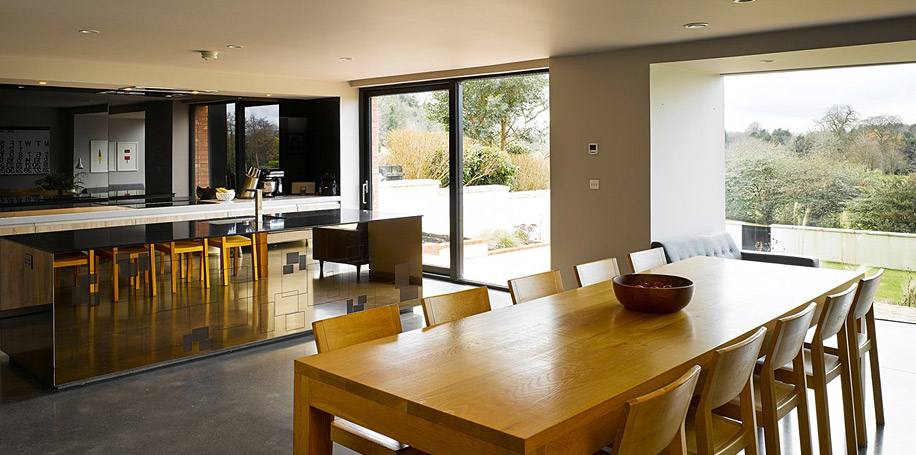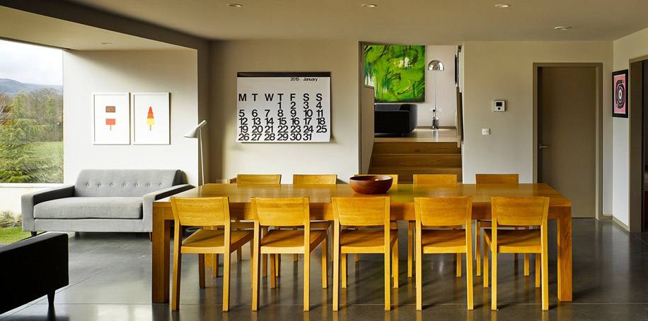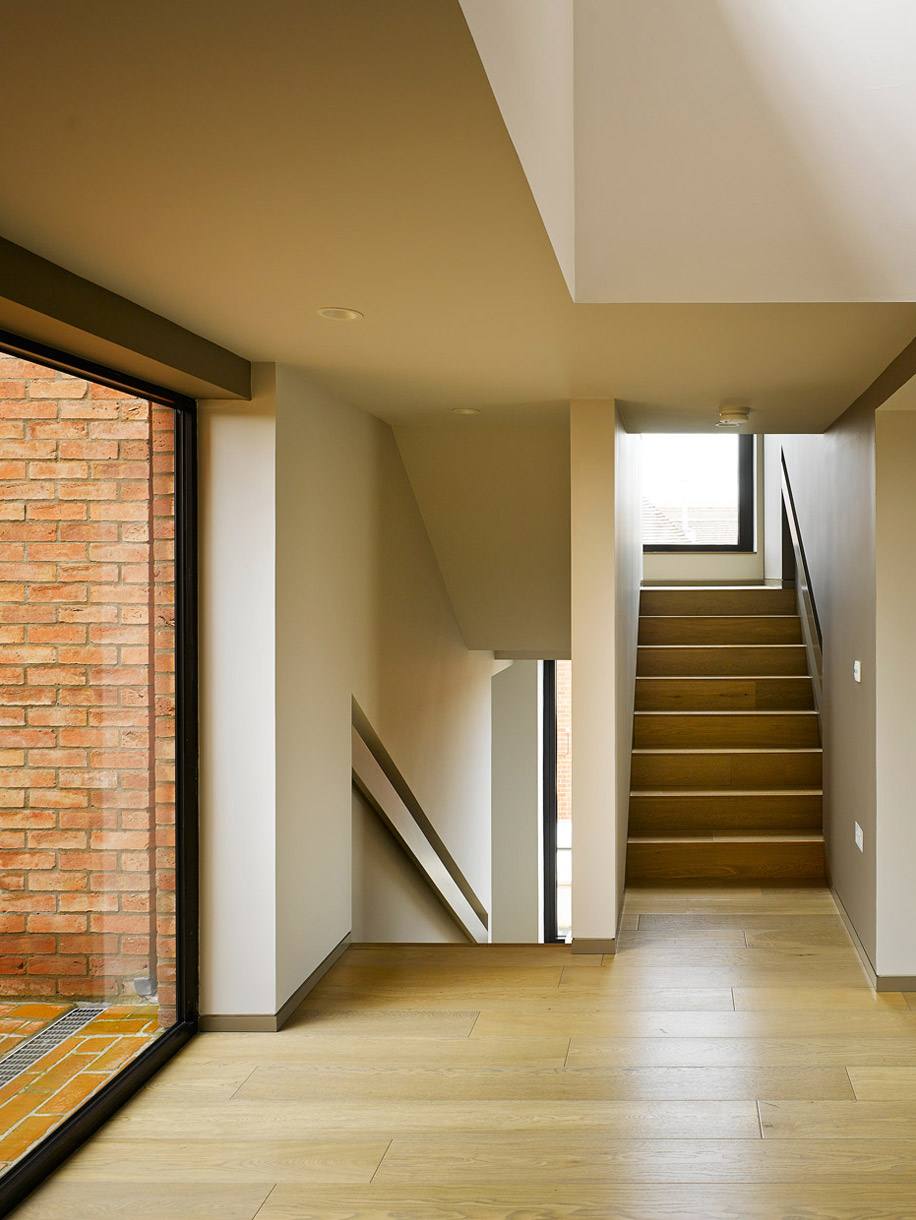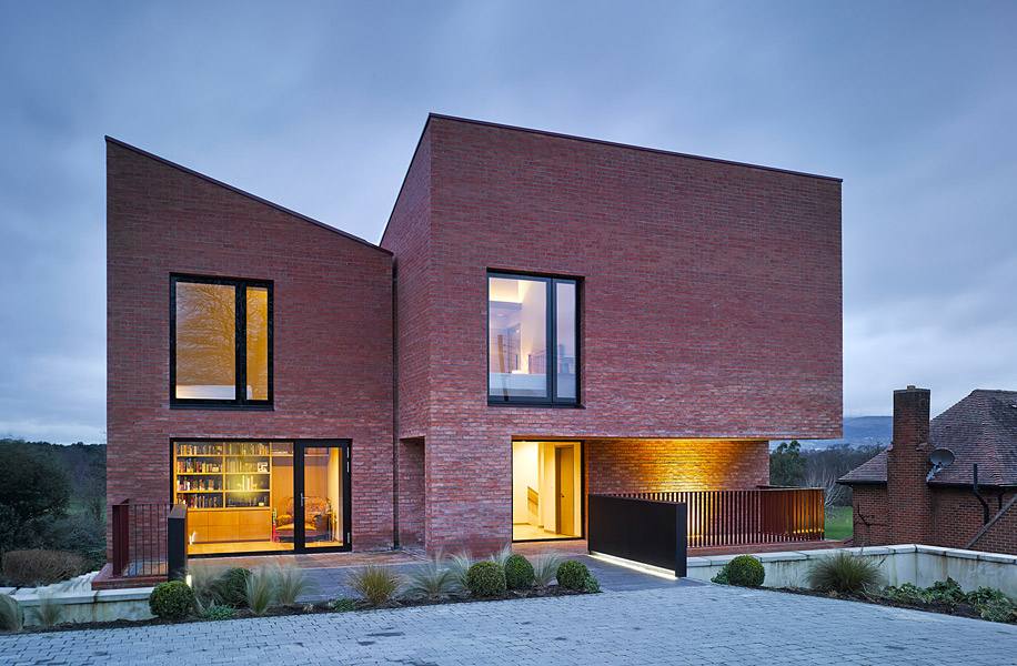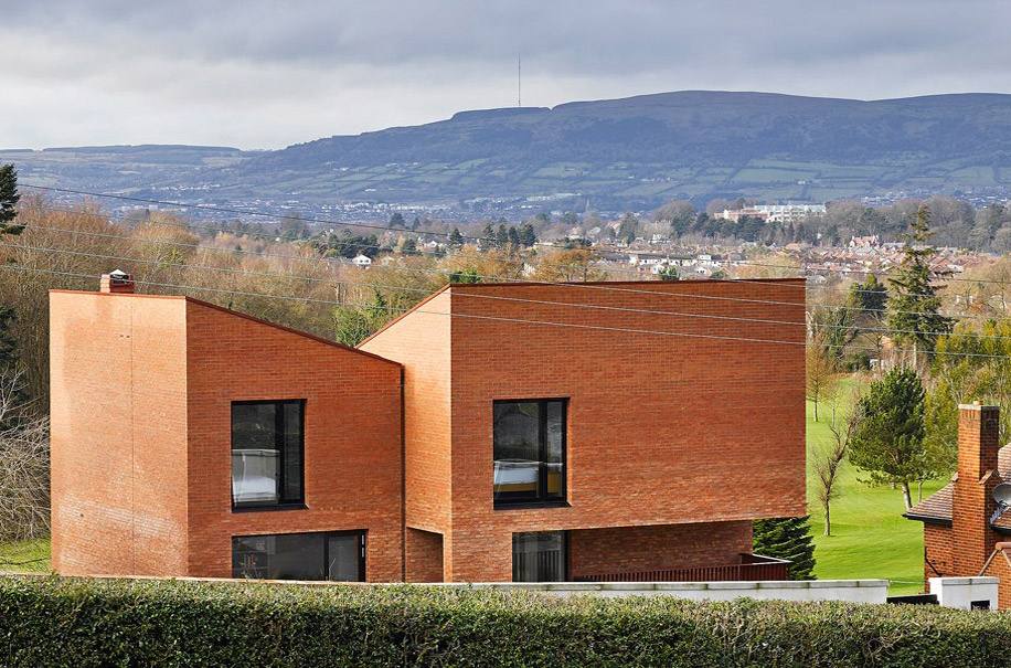 Дом для семьи с 4 детьми построен на склоне к югу от центра города. Из окон открывается вид на ухоженные поля находящегося по соседству гольф-клуба Belvoir Park. Здание состоит из трех объемов, находящихся на разных уровнях по отношению друг к другу. Нижний этаж со стороны дороги не виден.