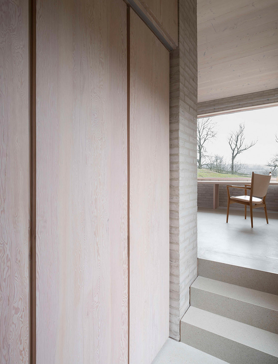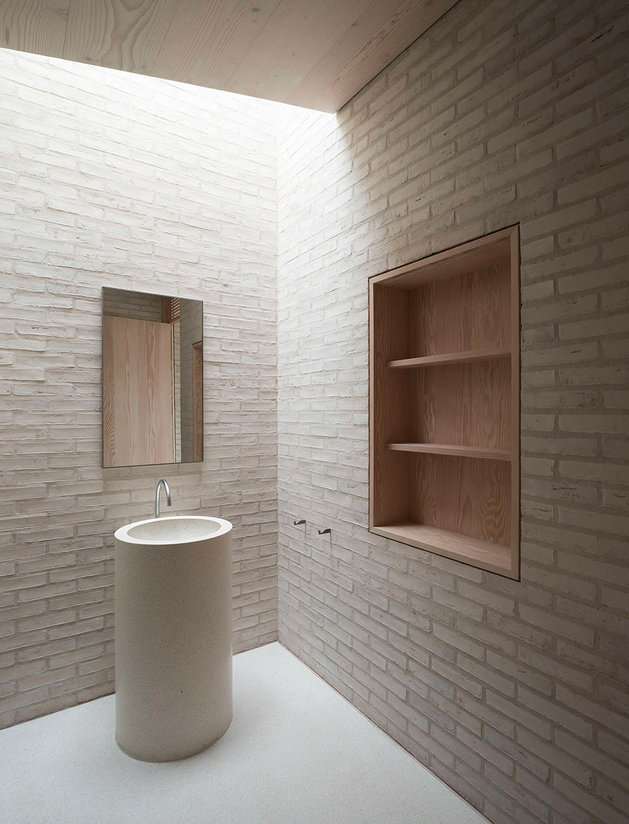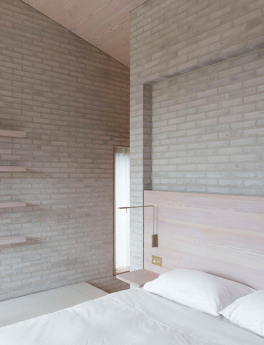 Основной материал проекта — кирпич ручной формовки из Дании, черный для наружных стен и белый для внутренней отделки. Как считает Джон Поусон, сочетание полированного бетонного (с кусочками мрамора) пола, светлого кирпича и пихтовых потолков создает умиротворяющий, полный спокойствия интерьер.