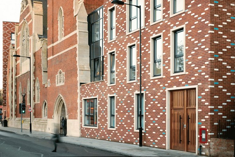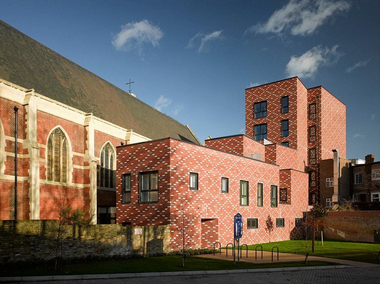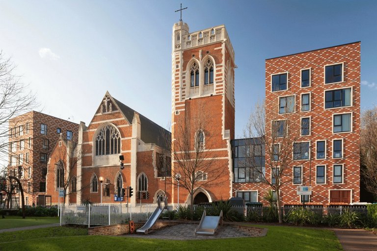 Вокруг здания церкви святой Марии в Восточном Лондоне построили три многоквартирных дома. Таким образом архитекторы из бюро Matthew Lloyd постарались решить поставленную перед ними задачу: усовершенствовать модель церковного комплекса так, чтобы община могла самостоятельно решать свои финансовые вопросы. А гармонировать со зданием церкви 19 века новым домам помогает кирпичная кладка с ромбовидным узором.