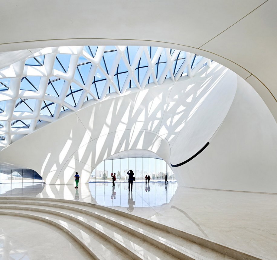 Фасад выполнен из гладких белых алюминиевых панелей, которые одновременно выражают грубость, резкость, угловатость и мягкость конструкции.