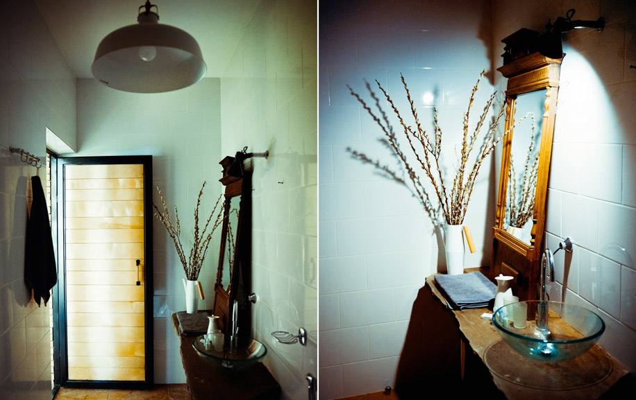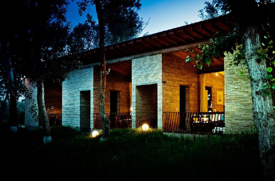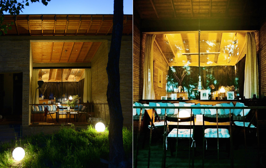 Евгений Задорожний, архитектор и дизайнер проекта: «Нейтральная одноэтажная архитектура несет особый заряд и находится в полной гармонии с природой. Спокойные каменные поверхности акцентируют внимание на природе. Тени листвы, колышущейся на ветру, словно оживляют тяжелые стены».Входные порталы сделали через один – «веранда-проем». В закрытых проемах расположена сушилка и место хранения личных вещей. На веранде – удобный уголок для отдыха.