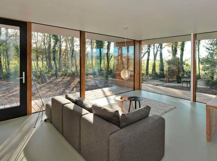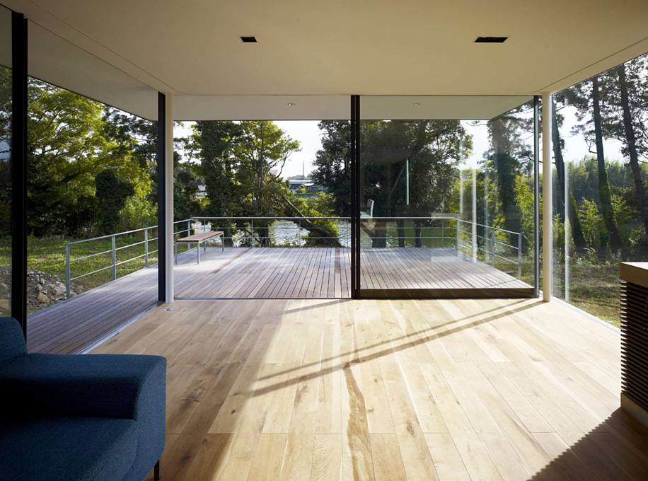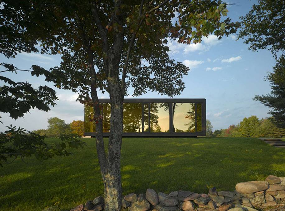 У этого дома два фасада: один застеклен обычным стеклом, второй – реверсивным. Такая зеркальная стена сохраняет частную жизнь владельцев дома и погружает интерьер в окружающую природу.