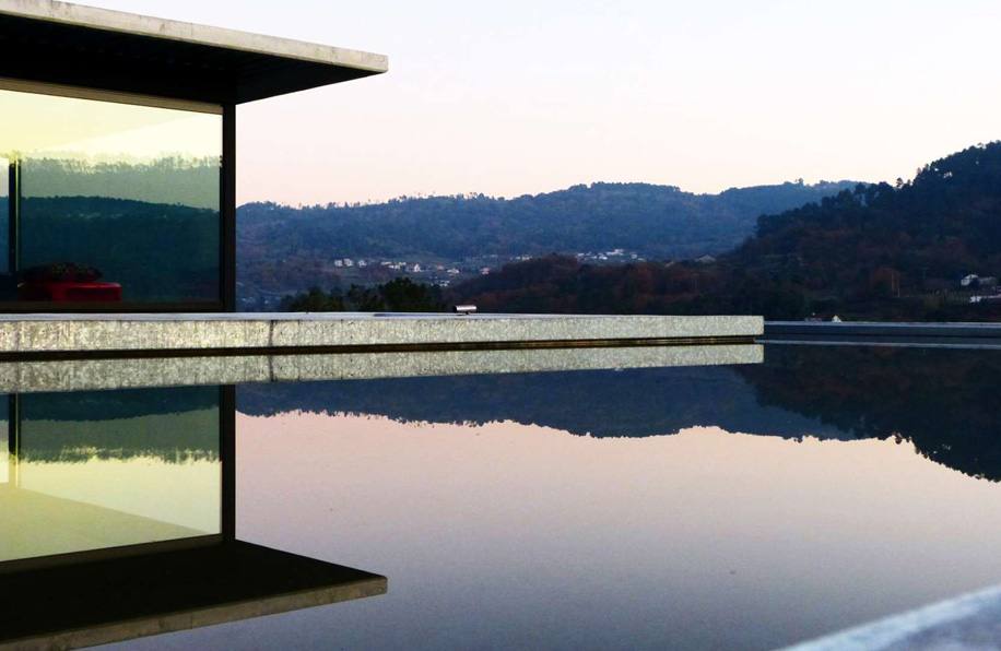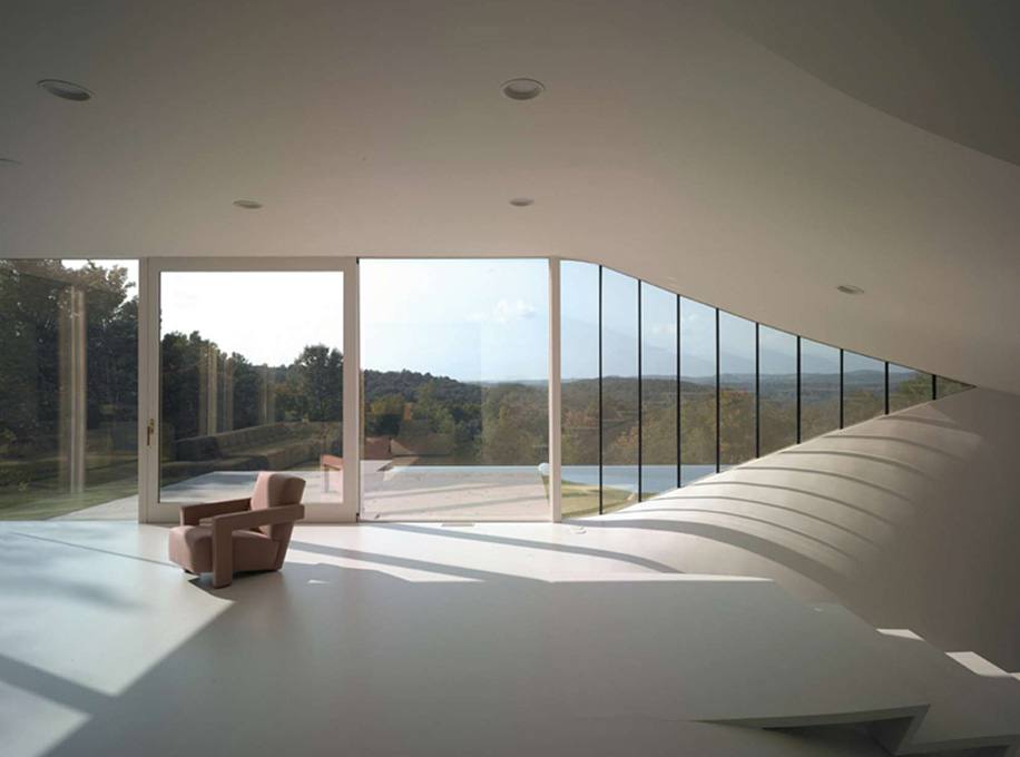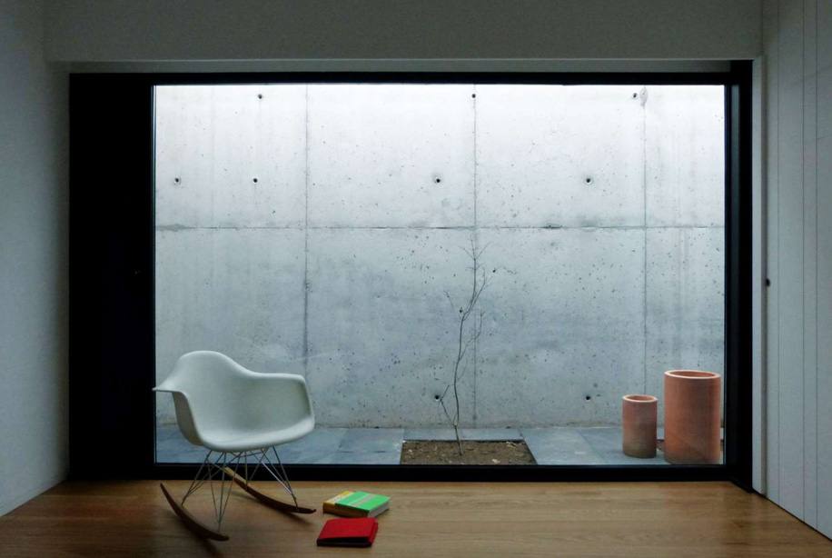 Из этого стеклянного дома открывается вид на горы. Бетонные стены создают закрытые, приватные коридоры.
