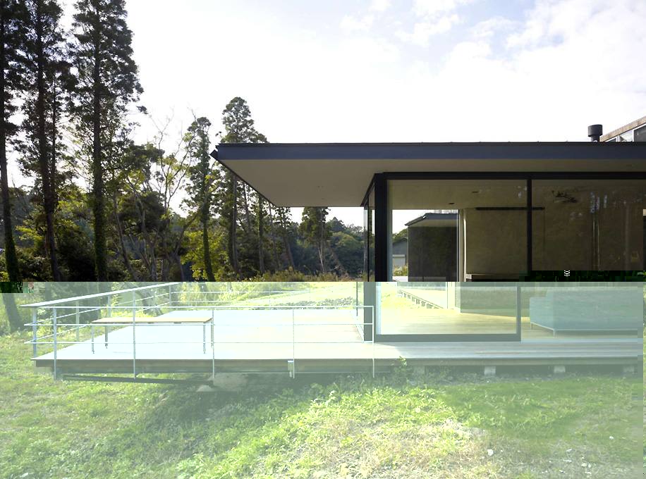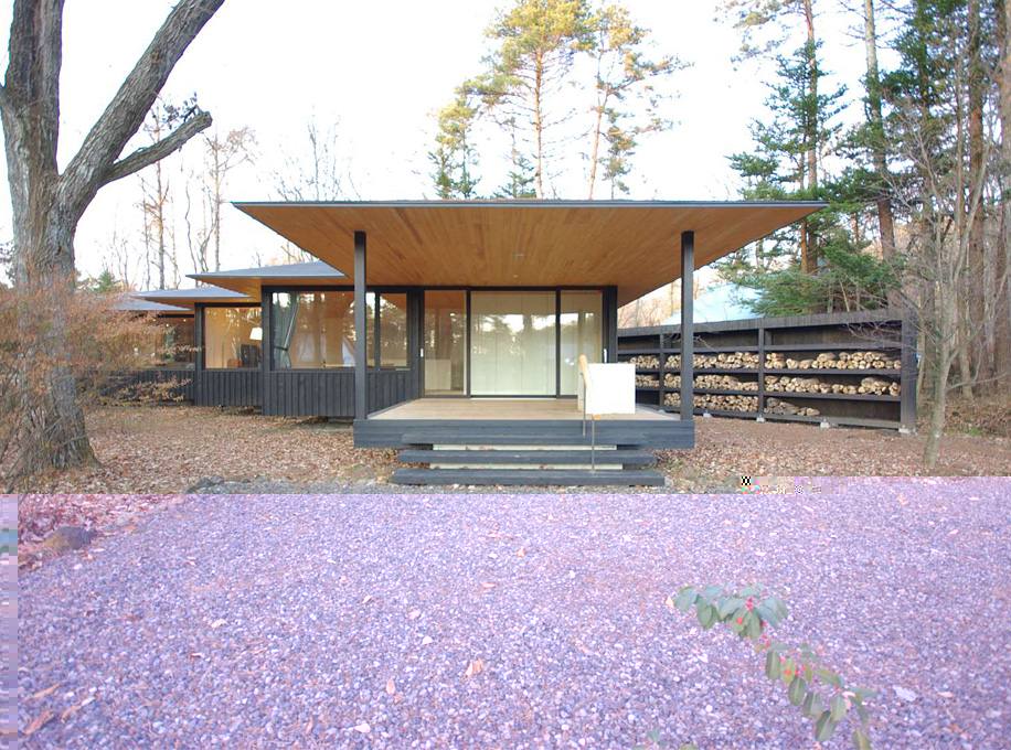 Мелкие ступени ко входу напоминают Дом Фарнсуорт. Обшивка деревянными панелями на крыше и полу переходит внутрь, чем дополняет облик дома, для которого характерны простые линии.