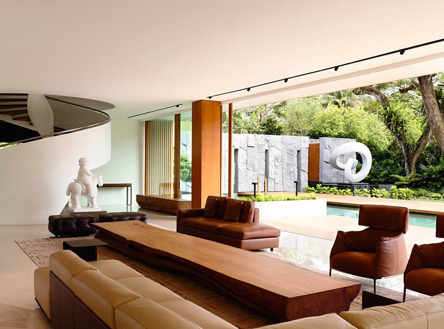 Натуральное дерево и бетонный фасад неожиданно переходят в стеклянные стены и затяжное патио, которые стирают грань между домом и внешней средой.