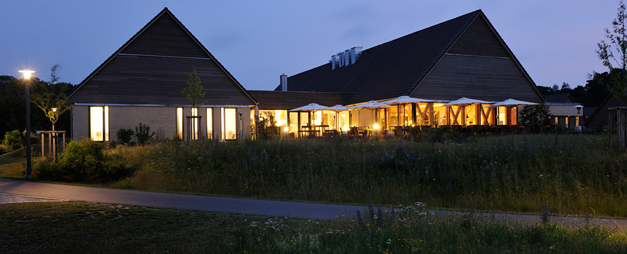 Здание ресторана отсылает к фахверковому строительству: снаружи видны балки, только стоят они под прямым углом.
