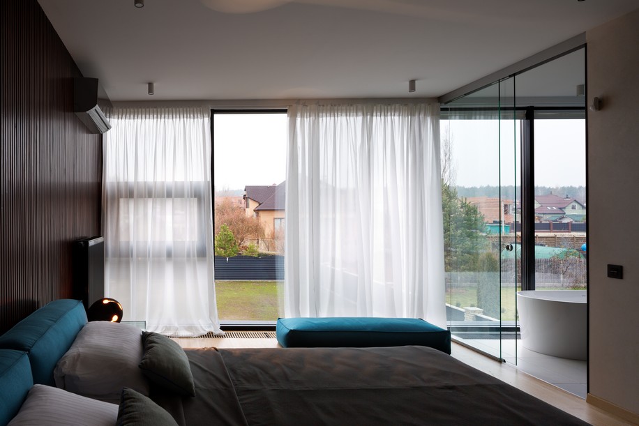 Грань между внешним и внутренним в проекте стерта за счет масштабного остекления общественной зоны и хозяйской спальни на втором этаже. Гостевая часть дома представлена функциональной зоной, которая объединяет кухню с островом, столовую, гостиную и большую библиотеку высотой около 6 метров.