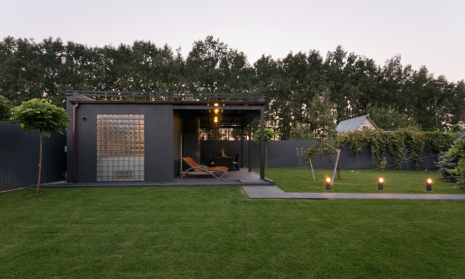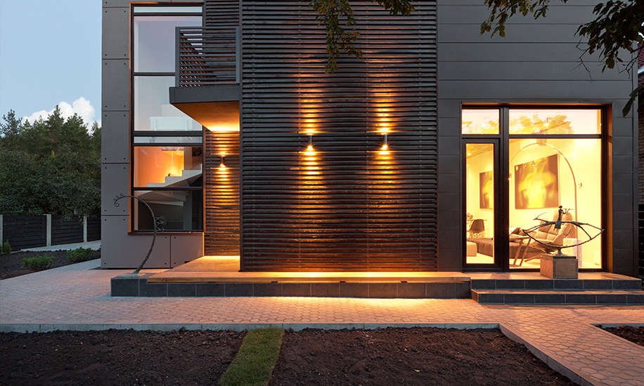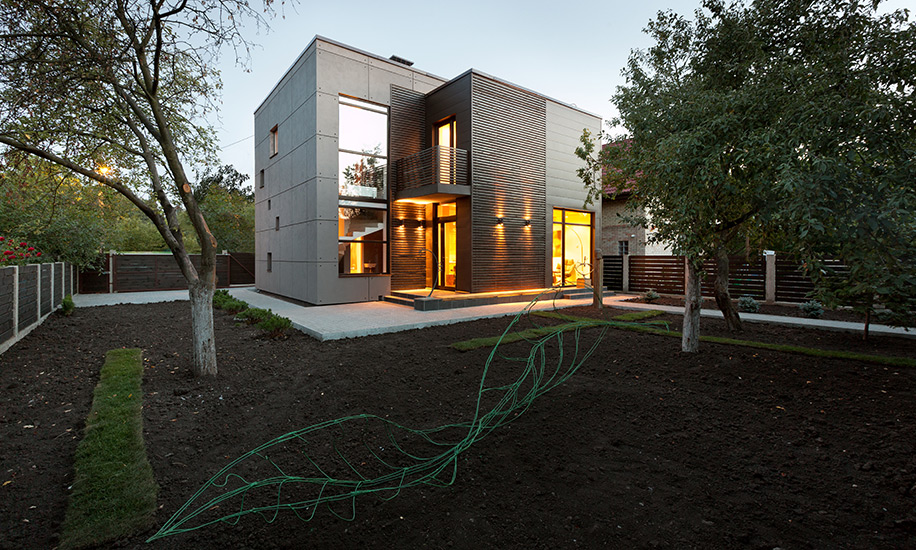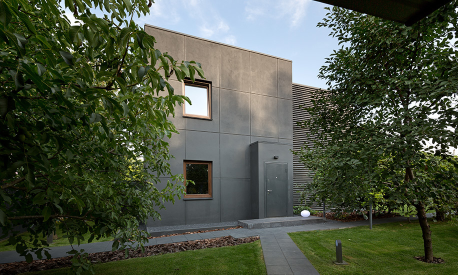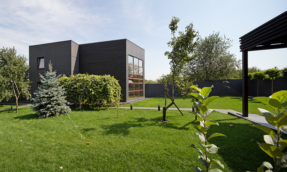 Владельцы участка давно знакомы с архитектором, поэтому позволили Сергею Махно поэкспериментировать, полностью доверившись его вкусу. При проектировании здания за основу была взята идея контрастов: здесь мощный объем из кирпича связан с хрупкими на вид балками под ним, строгие прямые линии фасада соседствуют с покрытой круглыми спилами дуба стеной, черный клинкер встречается с белыми бетонными плитами.