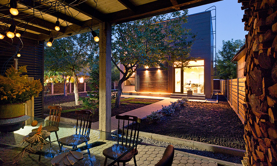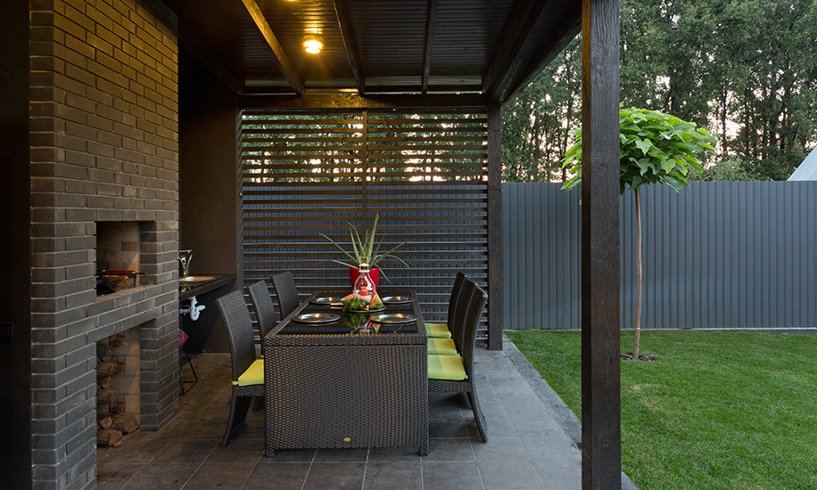 Во внутреннем дворе располагается уютная терраса, а рядом стоит многофункциональная пристройка, которая объединяет в себе место для отдыха, зону барбекю, навес для машины и подсобное помещение.