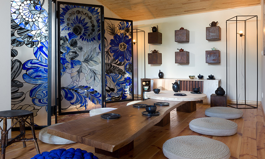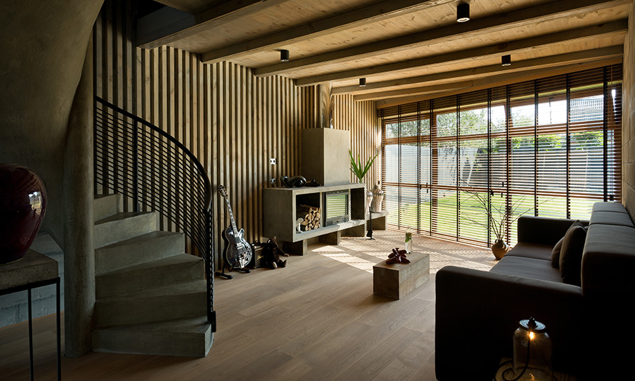 На двух этажах общей площадью 150 метров уместили необходимый минимум: объединенное пространство кухни-гостиной-столовой, три спальни (одна на первом этаже, две – на втором), два санузла и подсобные помещения. Места хватило даже для комнаты отдыха и чайных церемоний. В интерьере всё максимально простое и натуральное: окрашенные стены, бетонные лестницы, на потолке – дерево, на полу – дерево (на втором этаже) и керамическая плитка (на первом).