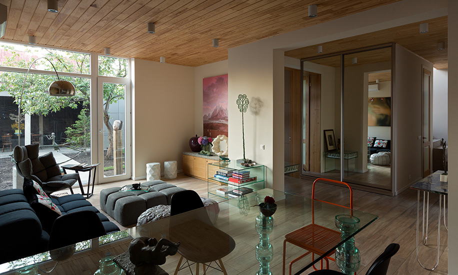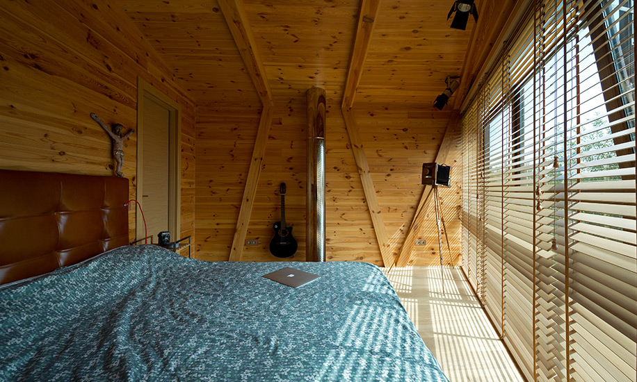 Одна из стен здания почти полностью остеклена (гостиная на первом этаже и спальня над ней с большими панорамными окнами), благодаря чему стирается грань между интерьером и экстерьером.