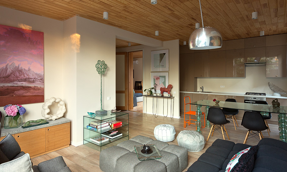 Атмосферу задают узнаваемые предметы дизайна и произведения искусства. В гостиной это культовые диван и кресло B&B Italia, стулья Vitra, а также торшер Arco от Акилле Кастильони. Здесь же – стеклянный стол с ножками из высоковольтных изоляторов Book Table, консоль Up и деревянный комод с бетонной столешницей (всё – предметы по дизайну Сергея Махно).