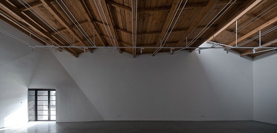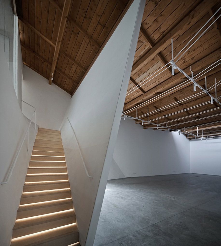 Старые стены было решено сохранить, усилив конструкцию, а все внутренние перегородки снесли, чтобы получить максимально открытое, просторное выставочное пространство. Фасад облицевали старым кирпичом.