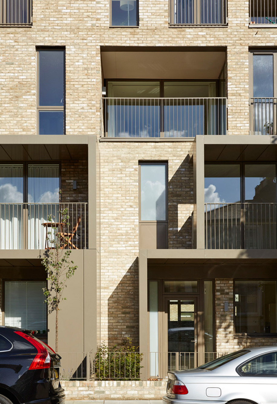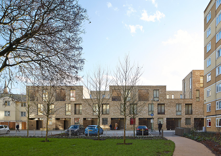 Для оформления фасада выбрали облицовочный кирпич песчаного цвета, который делает улицу чуть светлее. Кроме того, он стирает внешние различия между частным сектором и квартирами социального найма, устраняя акценты на достатке жильцов.