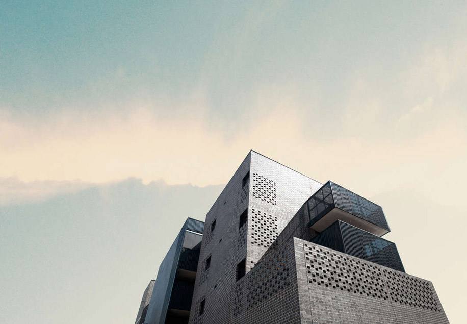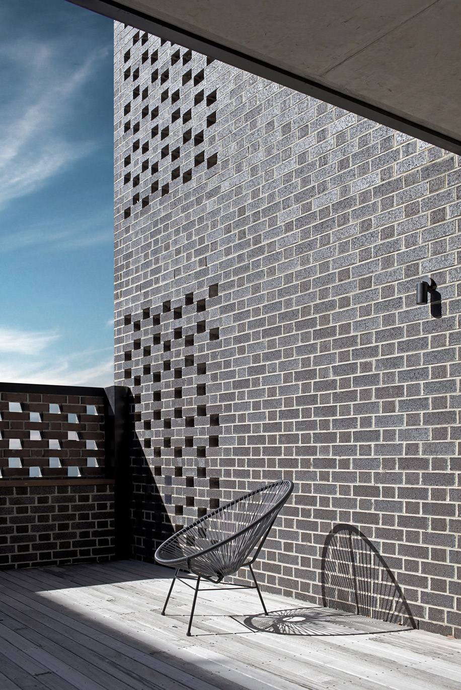 Узоры и перфорации на здании – результат экспериментов студии с компоновкой кирпича в разной последовательности. Этот кирпич в сочетании с маленькими отверстиями, выходящими на улицу, сохраняет приватность частной жизни жильцов и в то же время пропускает естественный свет.